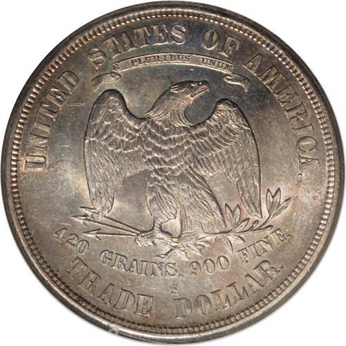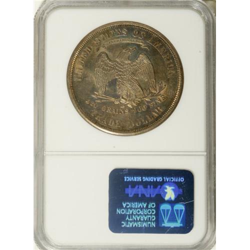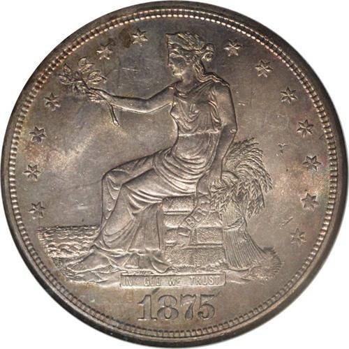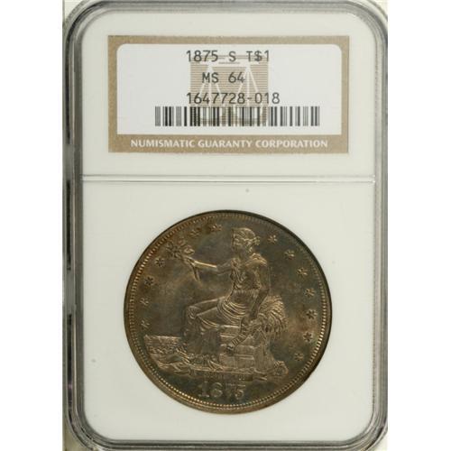 <B>1875-S T$1 MS64 NGC.</B></I> Type One Reverse. Large S mintmark. Well struck throughout with a few tiny abrasions visible with a glass--these accounting for the less-than-Gem grade. Each side has a coating of bright rose toning that in turn rewards the careful observer with a palette of colors.<BR><BR><b>Shipping:</b> Coins & Currency (<a target="_blank" href="http://www.heritageauctions.com/common/shipping.php">view shipping information</a>)