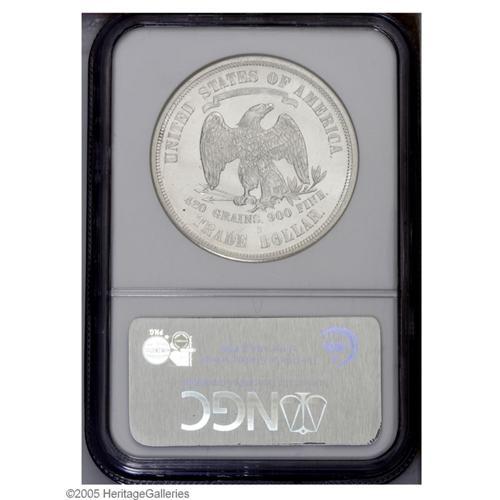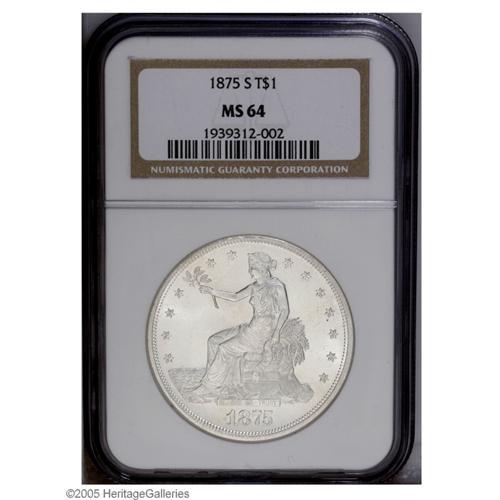 <B>1875-S<T$1> MS64 NGC.</B></I> Type One obverse and reverse. This coin is fully brilliant, with shimmering mint luster and few appreciable surface blemishes. Scattered wispy marks reside in the fields, on each side, but none are individually distracting. A flashy Trade Dollar, with bright, radiant surfaces. Highly attractive and, save for a bit of striking deficiency on Liberty's head very close to Gem quality.