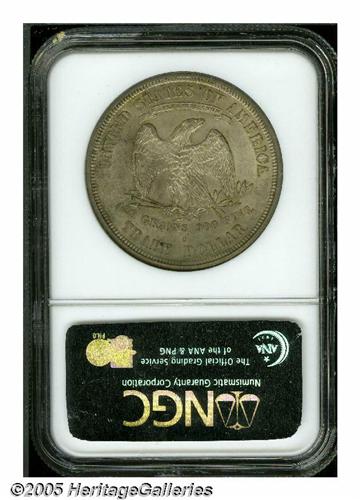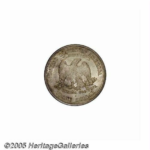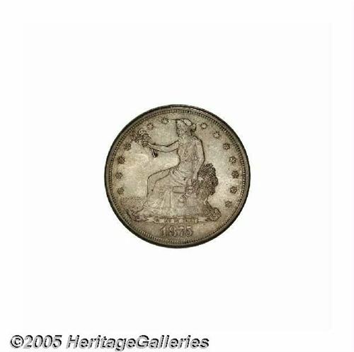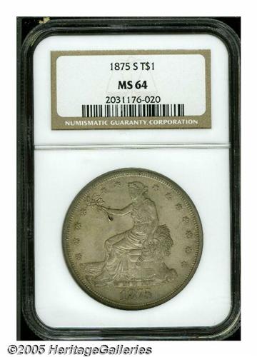 <B>1875-S<T$1> MS64 NGC.</B></I> Type Two Reverse. The specialist must examine the reverse of this example closely. The bottoms of the letters and numerals in 420 GRAINS, 900 FINE and TRADE DOLLAR are finely doubled below. The mintmark, however, is clearly not doubled. Although minor, it appears that this is a <B>previously unknown doubled reverse die.</B></I> This piece is generally well struck with only slight softness present on Liberty's head and the uppermost stars. The surfaces have a uniform gray patina but the mint luster is present, although subdued, beneath the toning.