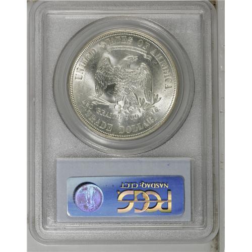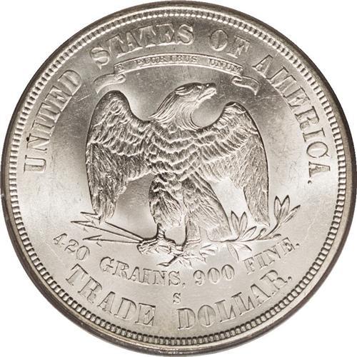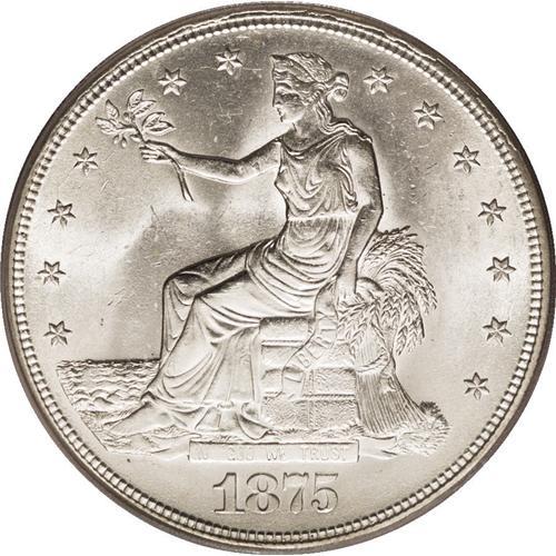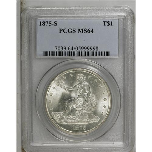 <B>1875-S T$1 MS64 PCGS.</B></I> Breen-5791, Type One Reverse, Large S. This boldly struck and brilliant near-Gem shimmers over each side, with a beautiful frosty sheen that ensures the remarkable eye appeal of the piece. Only Liberty's head and foot, the top of the eagle's left (facing) wing, and the right (facing) talons display some partial striking softness. Scattered wispy field marks apparently kept the coin from being graded as a Gem, but only by a slim margin.<BR><BR><b>Shipping:</b> Coin/Currency (<a target="_blank" href="http://www.heritageauctions.com/common/shipping.php">view shipping information</a>)