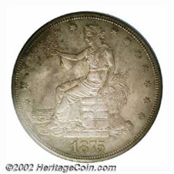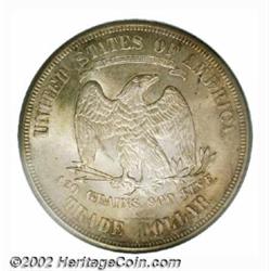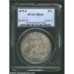 1875-S T$1 MS64 PCGS. Type One Obverse / Type One Reverse. An absolutely splendid type coin. The surfaces are highly lustrous and each side has an overlay of subtle gray-lilac and golden toning. Sharply struck throughout with no singularly distracting abrasions on either side. Important notice: We expect to be auctioning lots at the rate of 200-250 per hour. Sometimes eBay Premier live bid software cannot keep up with that pace, so we strongly recommend that you place a realistic proxy bid now as insurance to avoid disappointment. Also please note that all Heritage/CAA lots purchased through eBay Premier carry a 20% Buyer's Premium. Please make sure you read the Terms and Conditions.