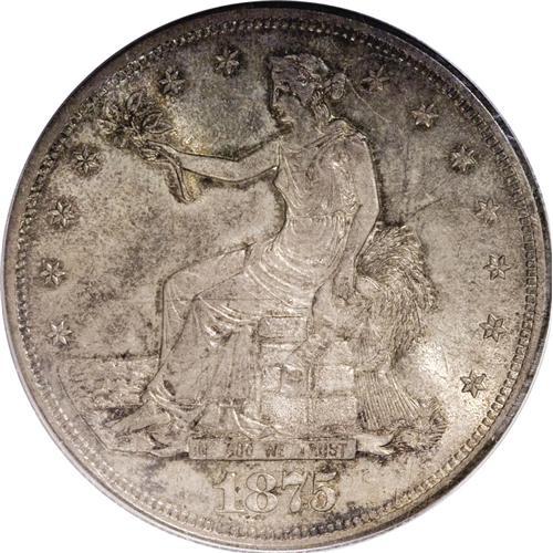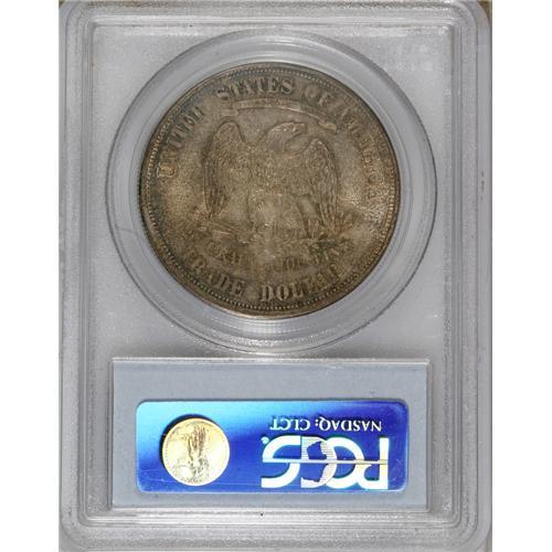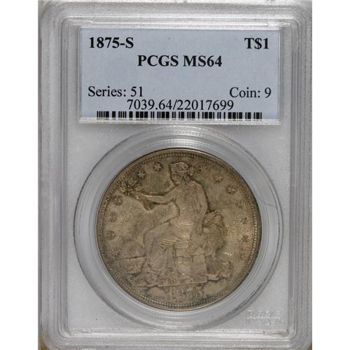 <B>1875-S T$1 MS64 PCGS.</B></I> Type One Obverse and Reverse. Large S. The San Francisco Mint made the lion's share of Trade dollars during their heyday from 1874 through 1878, due to its closer location to the Orient, the ultimate destination for much of the coinage. Dappled golden-brown and gunmetal-gray patina embraces this satiny and suitably struck near-Gem. Thorough inspection of the fields beneath a loupe locate no underlying abrasions. A worthy contribution to an originally toned silver type set.<BR><BR><b>Shipping:</b> Coins & Currency (<a target="_blank" href="http://www.heritageauctions.com/common/shipping.php">view shipping information</a>)