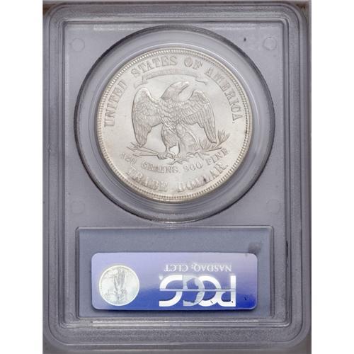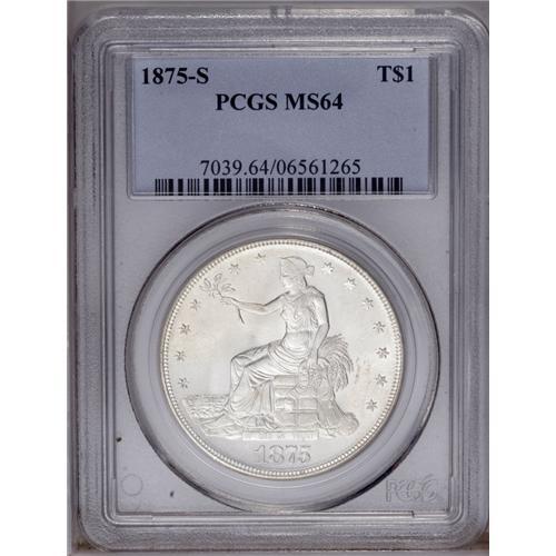 <B>1875-S<T$1> MS64 PCGS.</B></I> Type One Obverse and Reverse. Shimmering luster with few appreciable surface marks, perhaps being kept from Gem status by a bit of isolated striking deficiency on the central devices. Each side presents a fully brilliant, untoned appearance.