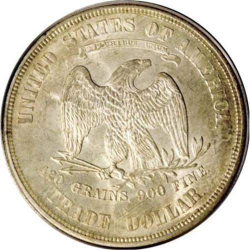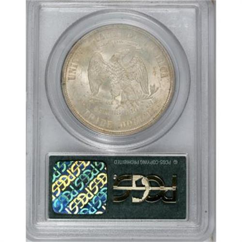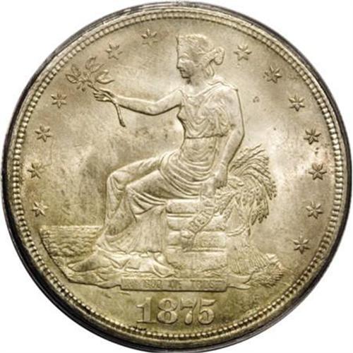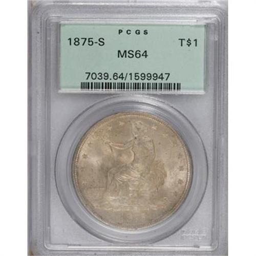 <B>1875-S T$1 MS64 PCGS.</B></I> Type One obverse and reverse. Light golden-gray patination resides on highly lustrous surfaces. The design elements are well struck, except for weakness in Liberty's hair. A few minute handling marks define the grade, and a few as-made roller marks are visible on the lower reverse. Housed in a green-label holder.<BR><BR><B>Coin Engraver:</B> William Barber<BR><BR><b>Shipping:</b> Coins & Currency (<a target="_blank" href="http://www.heritageauctions.com/common/shipping.php">view shipping information</a>)