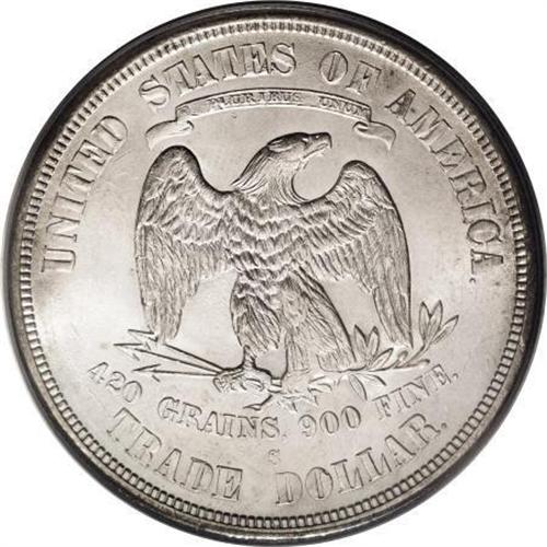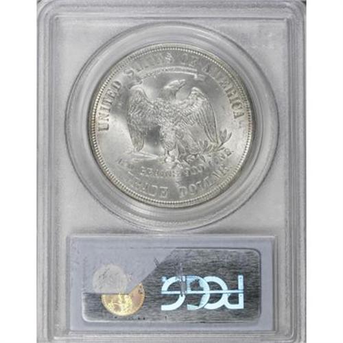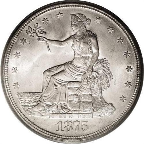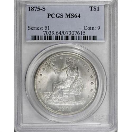 <B>1875-S T$1 MS64 PCGS.</B></I> Type One Reverse, Large S Mintmark. The reverse has a short die line from the stem to the tip of the left claw is parallel to the bottom arrow shaft, perhaps worth closer examination by a specialist. In addition, some close doubling on the reverse is machine or strike doubling. Both sides are fully brilliant and lustrous with frosty silver surfaces.<BR><BR><B>Coin Engraver:</B> William Barber<BR><BR><b>Shipping:</b> Coins & Currency (<a target="_blank" href="http://www.heritageauctions.com/common/shipping.php">view shipping information</a>)