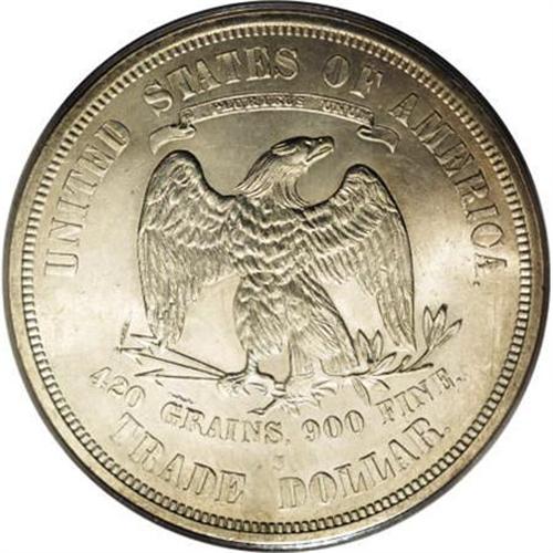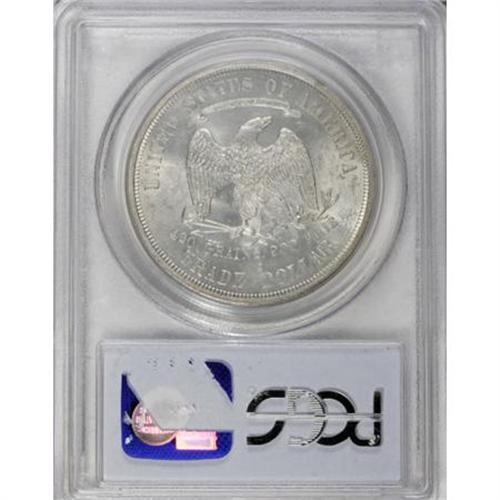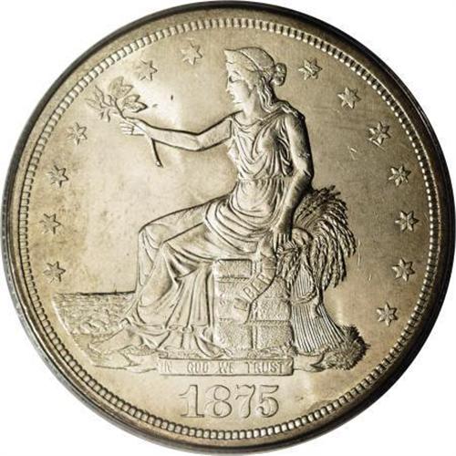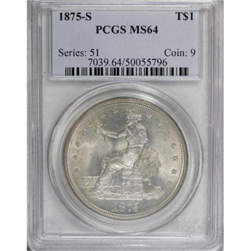 <B>1875-S T$1 MS64 PCGS.</B></I> Type One Reverse, Large S mintmark. Essentially brilliant with a hint of color, shimmering mint luster, and few appreciable surface marks. A couple of noticeable abrasions are seen on Liberty's left arm, one is above the GR of GRAINS on the reverse. A flashy Trade dollar, with bright, radiant surfaces. Utterly frosty and, save for a bit of striking deficiency at the top of the obverse and a milling mark above GR on the lower reverse, very close to Gem quality.<BR><BR><B>Coin Engraver:</B> William Barber<BR><BR><b>Shipping:</b> Coins & Currency (<a target="_blank" href="http://www.heritageauctions.com/common/shipping.php">view shipping information</a>)