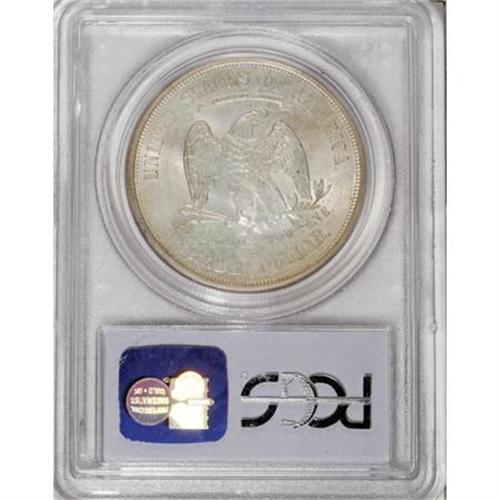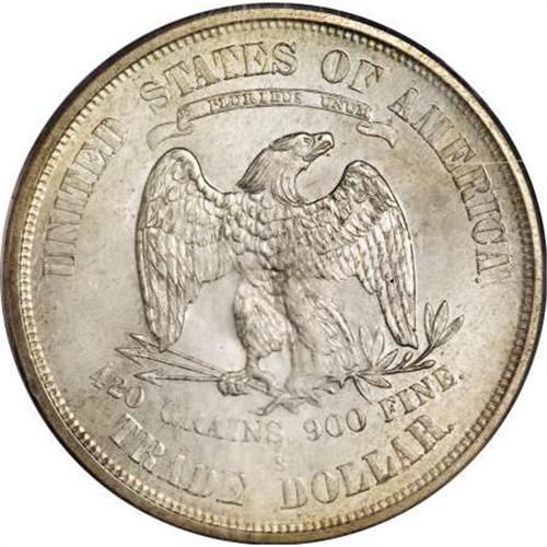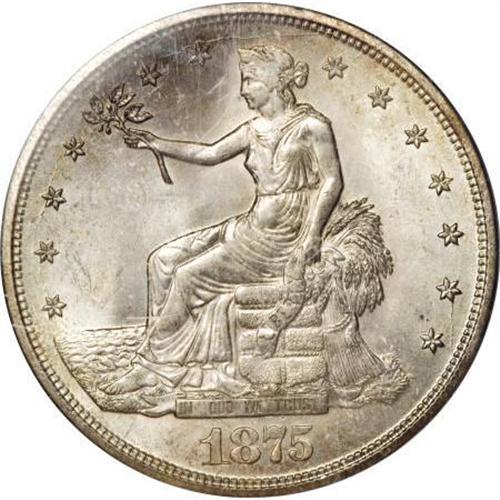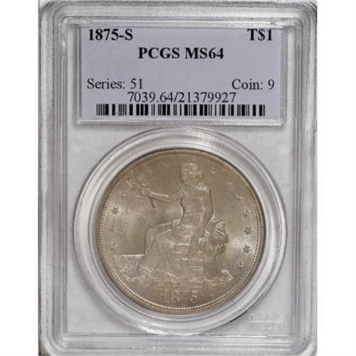 <B>1875-S T$1 MS64 PCGS.</B></I> Type One Obverse and Reverse. Large S. Dusky almond-gold toning graces this lustrous type coin. The strike is attentive aside from moderate incompleteness on the eagle's right (facing) leg and Liberty's hair. The reverse is essentially immaculate, and obverse marks are generally limited to the lower left obverse field.<BR><BR><B>Coin Engraver:</B> William Barber<BR><BR><b>Shipping:</b> Coins & Currency (<a target="_blank" href="http://www.heritageauctions.com/common/shipping.php">view shipping information</a>)