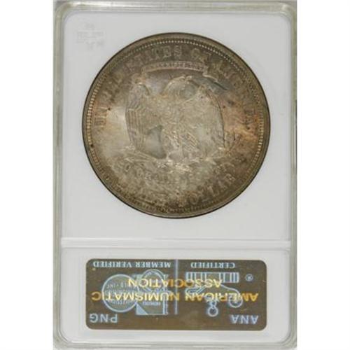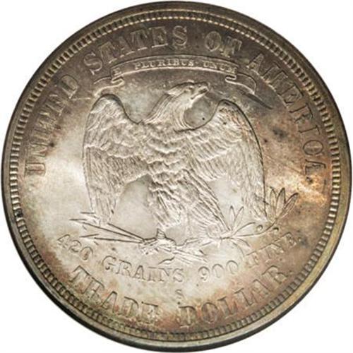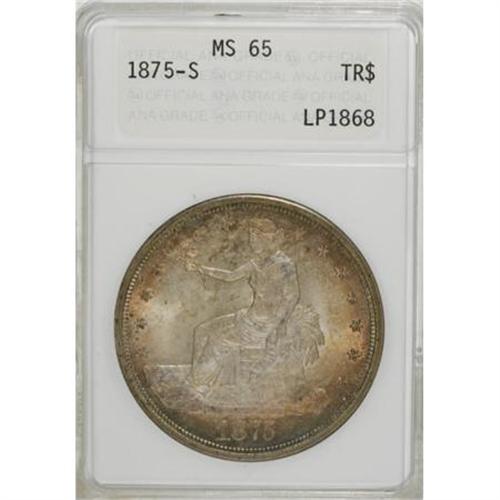 <B>1875-S T$1 MS65 ANACS.</B></I> Type Two Reverse. Large S. Dusky golden-brown and orange patination at the margins mingles with bluish-gray and lavender, framing champagne-gold and ice-blue centers. Excellent definition shows on the design elements, save for the usual softness in Liberty's hair. Well preserved, highly lustrous surfaces are devoid of any mentionable marks.<BR><BR><B>Coin Engraver:</B> William Barber<BR><BR><b>Shipping:</b> Coins & Currency (<a target="_blank" href="http://www.heritageauctions.com/common/shipping.php">view shipping information</a>)