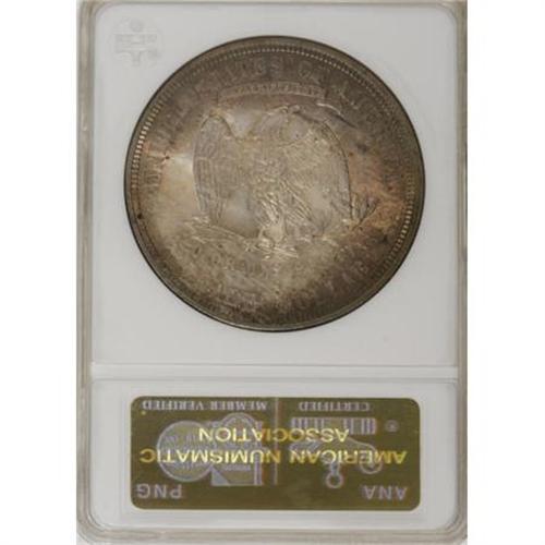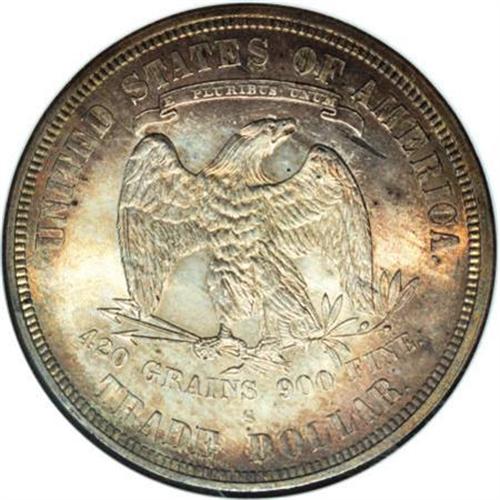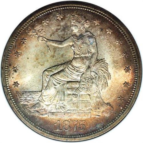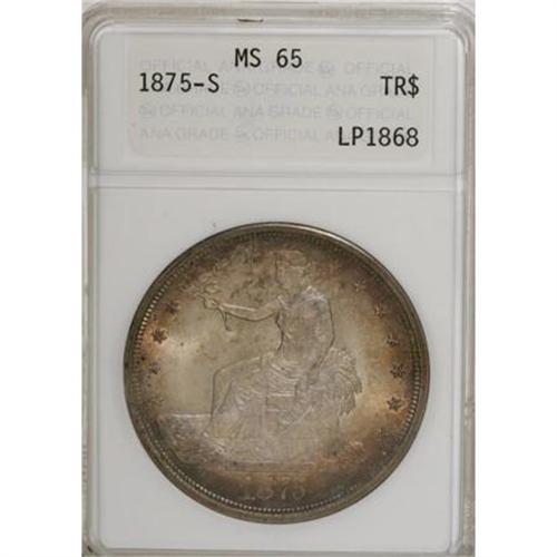 <B>1875-S T$1 MS65 ANACS.</B></I> Type Two Reverse. Large S. Dusky golden-brown and orange patination at the margins mingles with bluish-gray and lavender, framing champagne-gold and ice-blue centers. Excellent definition shows on the design elements, save for the usual softness in Liberty's hair. Well preserved, highly lustrous surfaces are devoid of any mentionable marks. A conditionally scarce issue at this grade level, and rare any finer.<BR><BR><B>Coin Engraver:</B> William Barber<BR><BR><b>Shipping:</b> Coins & Currency (<a target="_blank" href="http://www.heritageauctions.com/common/shipping.php">view shipping information</a>)
