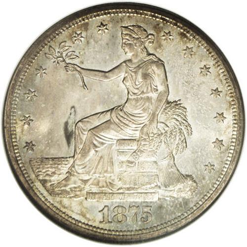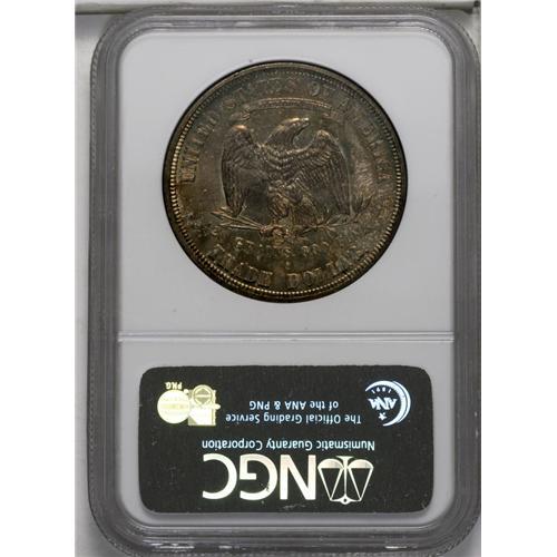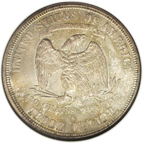 <B>1875-S<T$1> MS65 NGC.</B></I> Type One Obverse, Type Two Reverse. NGC and PCGS have seen about 50 1875-S Trade dollars grading MS65, and fewer than 20 examples designated finer. Potent luster underlies a melange of powder-blue, gold-tan, and lavender toning that is joined on the reverse by dappled olive-green. The design features are sharply impressed throughout, though a touch of softness is noted in the radials of a couple of stars along the right border. Well preserved surfaces reveal just a few minute marks on Liberty's midsection.
