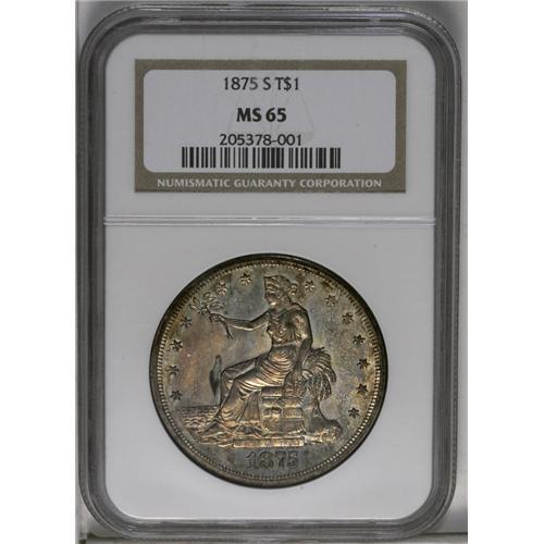 1875-S T$1 MS65 NGC. Type One Obverse, Type Two Revers