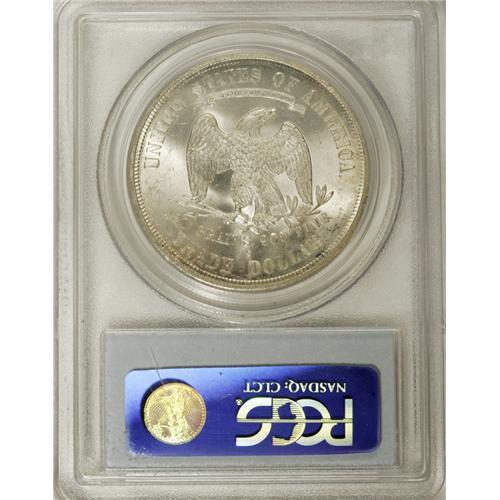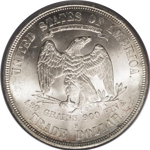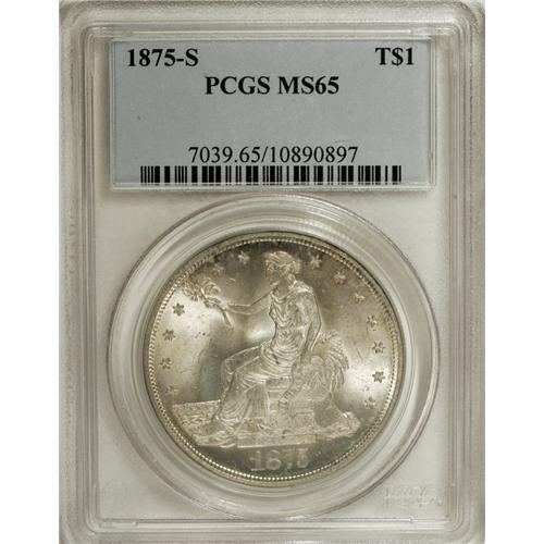 <B>1875-S T$1 MS65 PCGS.</B></I> Type One Reverse. Large S mintmark. Quite a few Trade dollars were set aside as novelties at the time of issue and shortly thereafter. However, they were not legal tender in the United States at that time and were regarded more as bullion pieces that were produced for export to the Orient. A few high grade pieces, such as this one, were carefully preserved and qualify today as Gem Uncirculated. This beautiful example has bright, coruscating mint luster and it also displays strong definition in all areas. Generally brilliant, there is also just the slightest hint of pale patina around the margins on each side. Population: 20 in 65, 13 finer (1/07).<BR><BR><b>Shipping:</b> Coins & Currency (<a target="_blank" href="http://www.heritageauctions.com/common/shipping.php">view shipping information</a>)