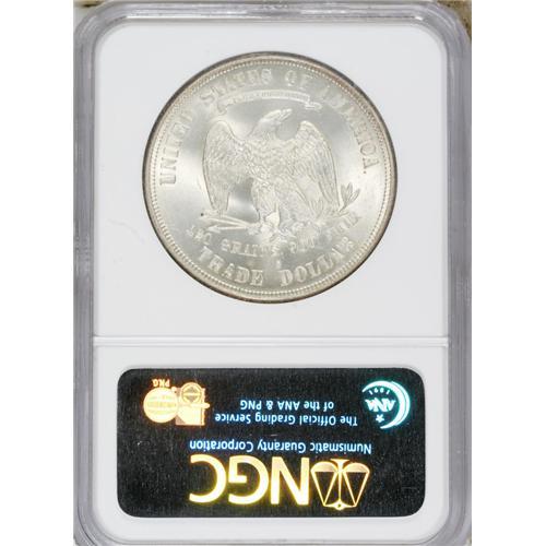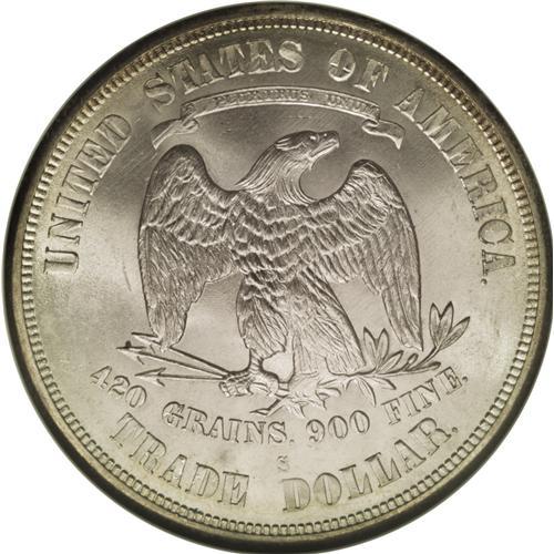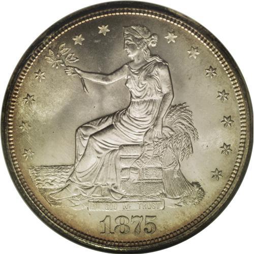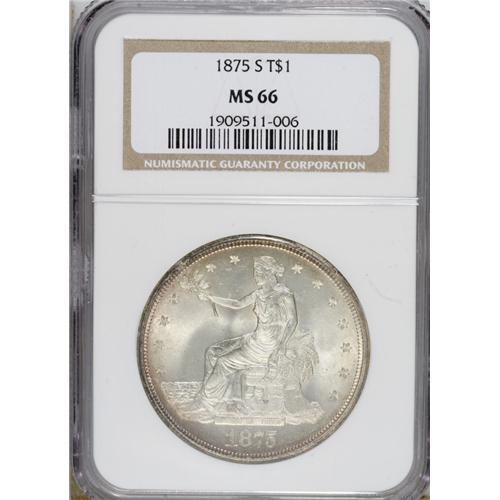 <B>1875-S T$1 MS66 NGC.</B></I> Type One Reverse, Large S. Type One shows a berry below the left (right facing) claw. The 1875-S Trade dollar sported a mintage of 4.487 million pieces. David Bowers, in his <I>Silver Dollars & Trade Dollars of the United States,</B></I> indicates that: "While the majority of such coins were exported, thousands went into circulation on the West Coast ... where they traded at face value in commercial transactions." The issue is relatively available in Mint State, especially through MS64. Bowers even considers MS65 pieces obtainable: "In MS65 the 1875-S is the most available of all Trade dollars. I estimate that 75 to 150 or more exist." Interestingly though, NGC and PCGS have certified, to date, fewer than 55 pieces in this grade.<BR> The MS66 coin offered here is one of just 15 seen by the two grading services, and only three finer. Dazzling luster embraces both sides, and the only color on the coin (light purple) clings to the rims. The design elements are generally well struck, though softness is apparent on some of the star centers and on Liberty's hair and crown. The surfaces are quite well preserved for the grade. A few light roller marks are visible on each side. Census: 5 in 66, 0 finer (2/07).<BR><BR><b>Shipping:</b> Coins & Currency (<a target="_blank" href="http://www.heritageauctions.com/common/shipping.php">view shipping information</a>)