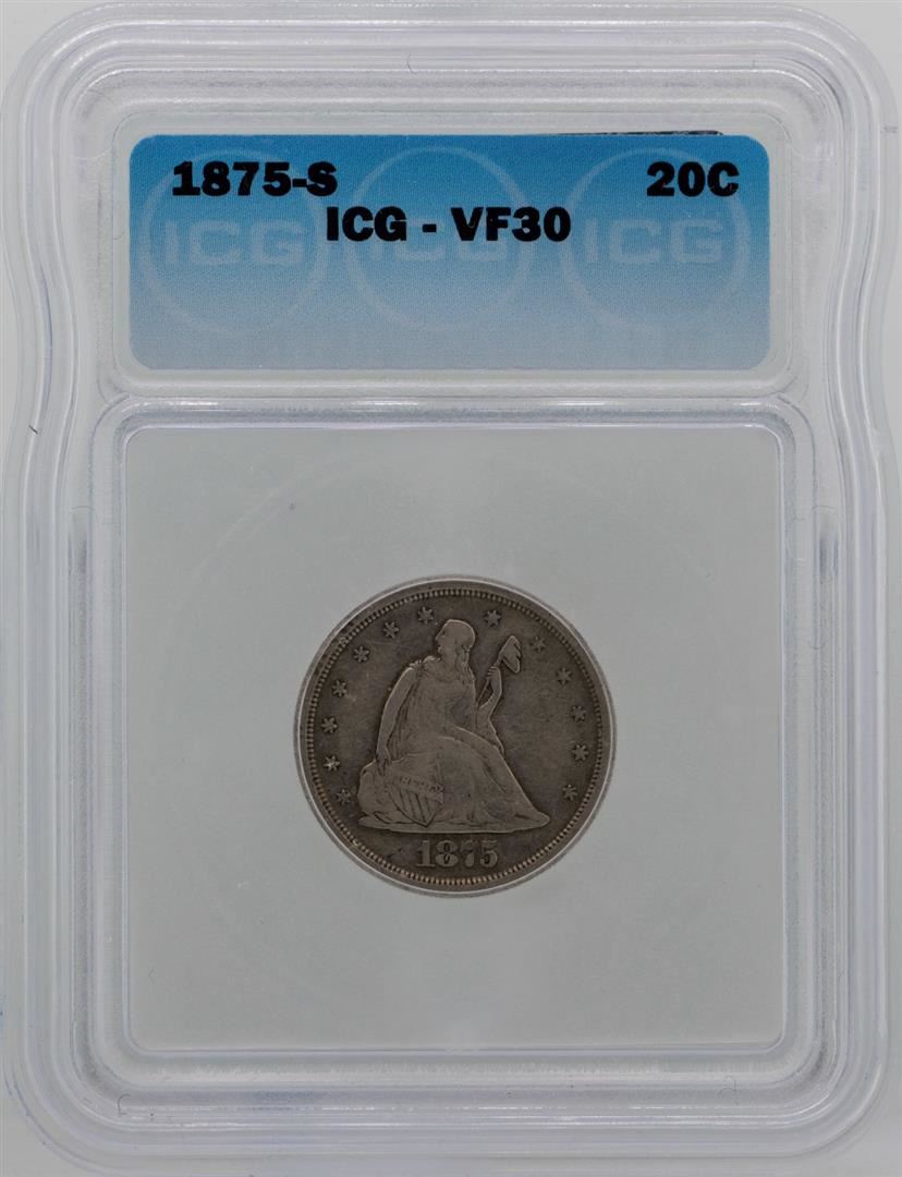 One 1875-S Twenty Cent Piece Coin ICG VF30. ICG Certified.