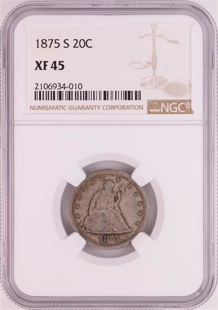 One 1875-S Twenty Cent Piece Coin NGC XF45. NGC Certified.