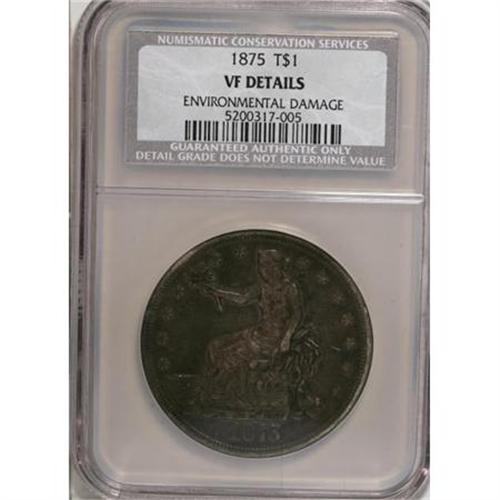 <B>1875 T$1 --Environmental Damage--NCS .VF Details.</B></I> NGC Census: (0/0). PCGS Population (0/0). Mintage: 218,200. (#7037)<BR><BR><B>Coin Engraver:</B> William Barber<BR><BR><b>Shipping:</b> Coins & Currency (<a target="_blank" href="http://www.heritageauctions.com/common/shipping.php">view shipping information</a>)