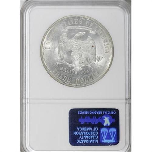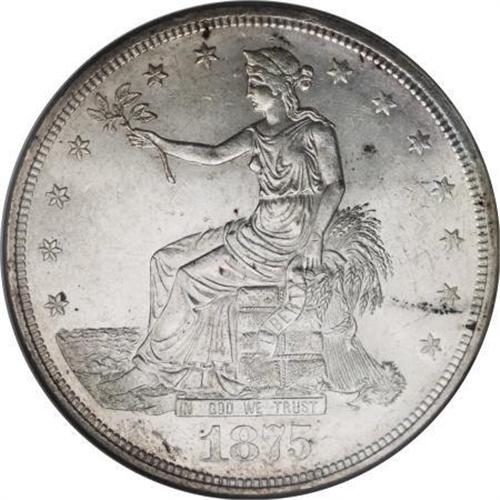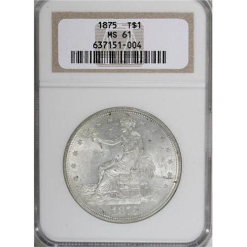 <B>1875 T$1 MS61 NGC.</B></I> Type Two Reverse. The low mintage 1875 is notoriously scarce in all grades. This lustrous representative has delicate gold toning and only minor incompleteness on the right-side stars and Liberty's hair. The fields have a few wispy grazes, but no marks stand in the way of a higher grade. <BR><BR><B>Coin Engraver:</B> William Barber<BR><BR><b>Shipping:</b> Coins & Currency (<a target="_blank" href="http://www.heritageauctions.com/common/shipping.php">view shipping information</a>)