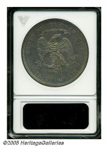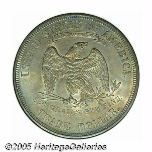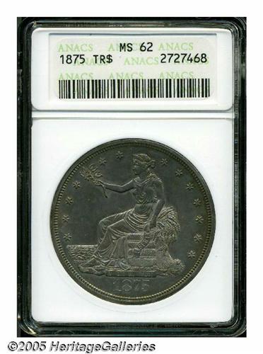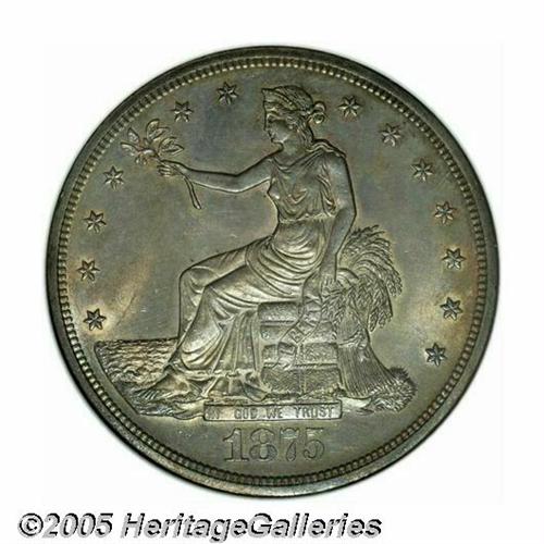 <B>1875<T$1> MS62 ANACS.</B></I> Rich gray-blue patina with accents of crimson-gold on each side. The strike is very good, but the luster is slightly subdued. The surfaces are very pleasing for the grade. Type Two reverse with no berry under claw.