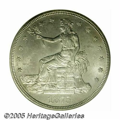 <B>1875<T$1> MS62 NGC.</B></I> Type Two Reverse. Fully lustrous. The obverse has pale champagne toning. The reverse is brilliant. The strike is typical for the issue with some areas of softness noted at Liberty's head and the eagle's left claw. Two different designs were used to make the reverse dies for the 1875 issue. On "Type I" examples, there is a berry on the olive sprig directly beneath the eagle's left claw (viewer's right), while on "Type II" examples, there is no berry. Although these differences were first pointed out to the numismatic community by Elliot Landau in 1952, the varieties didn't really catch the attention of the public until Walter Breen's <I>Encyclopedia</B></I> appeared in 1988, and ever since that time, collectors have been eagerly pursuing examples of both types.