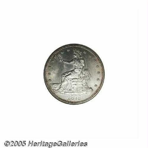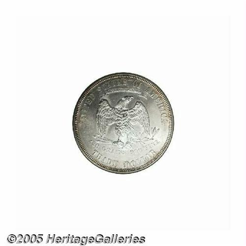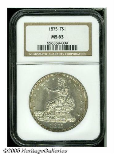 <B>1875<T$1> MS63 NGC.</B></I> Type Two Reverse with no berry in the eagle's claw. Mostly untoned with bright, satiny luster and a nominal amount of abrasions for the assigned grade. The obverse stars and the details of Liberty's head are unusually well defined. A particularly appealing example for the assigned grade.