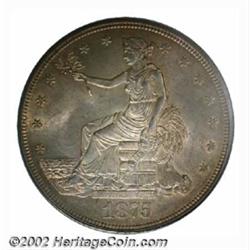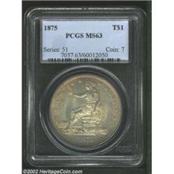 1875 T$1 MS63 PCGS. Type One Obverse / Type Two Reverse. Sharply defined throughout with soft, frost