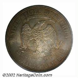 1875 T$1 MS63 PCGS. Type One Obverse / Type Two Reverse. Sharply defined throughout with soft, frosted mint luster. Each side is draped in light golden-rose toning. A nice, problem-free type coin. Important notice: We expect to be auctioning lots at the rate of 200-250 per hour. Sometimes eBay Premier live bid software cannot keep up with that pace, so we strongly recommend that you place a realistic proxy bid now as insurance to avoid disappointment. Also please note that all Heritage/CAA lots purchased through eBay Premier carry a 20% Buyer's Premium. Please make sure you read the Terms and Conditions.