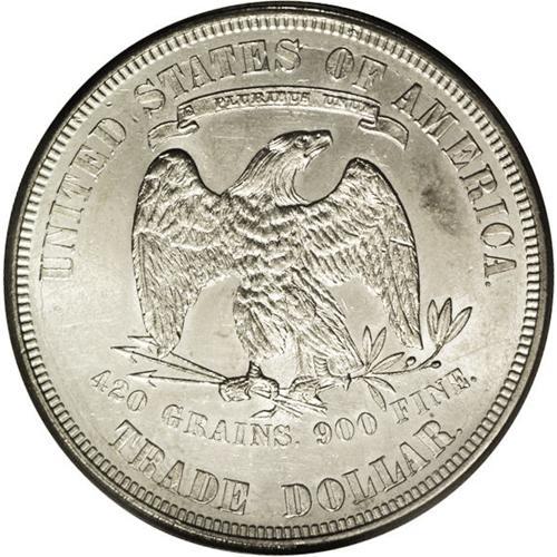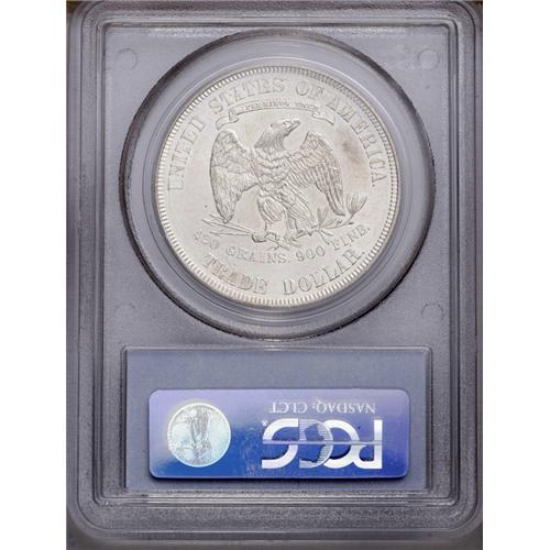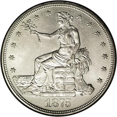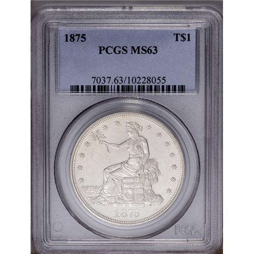 <B>1875<T$1> MS63 PCGS.</B></I> Type Two Reverse. A satiny and nearly brilliant example of this scarce issue. The strike is sharp throughout, and the surfaces are smooth save for tiny ticks on the cheekbone and neck. Other than the 1873-CC and 1878-CC keys, the 1875 has the lowest business strike mintage of the type. Population: 13 in 63, 19 finer (4/06).
