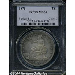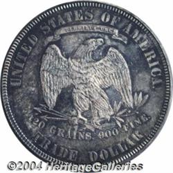 <B>1875<T$1> MS64 PCGS.</B></I> Beautifully colored in dove grey and light pink, with shimmering aquamarine and green tones available to the viewer when the coin is rotated. Nicely struck and clean for the grade, this Trade Dollar has plenty of luster that even the moderately heavy toning can fail to conceal. <BR><BR><B>Important notice:</B> Heritage usually auctions material at the rate of 200-250 lots per hour. On some occasions eBay Live bid software or the Internet may not be able to keep up with the pace of the auction. We recommend placing a realistic absentee bid now as insurance to avoid disappointment. Occasionally the auctioneer may eliminate or reject an eBay Live bid, and the auctioneer may also reopen a lot after the close of the eBay live bidding (usually because we missed an audience bid), and may reject your bid even if it shows you as the winning bidder. By bidding via eBay Live, you agree that Heritage may award the lot to another bidder at its sole discretion under the circumstances described above or any other reasonable circumstances. Since eBay bids are not shown to us until we open the lot on the floor, we treat those bids just like floor bids. In most cases the floor responds before the eBay bid is presented to us, due to Internet lag time, so for consistency we have made it a policy that floor bids are always considered first over tie eBay live bids. Also please note that all Heritage lots purchased through eBay Live carry a 20% Buyer's Premium. Please make sure you read the Terms and Conditions before you bid. </span></font></tr></table></td></tr></table>