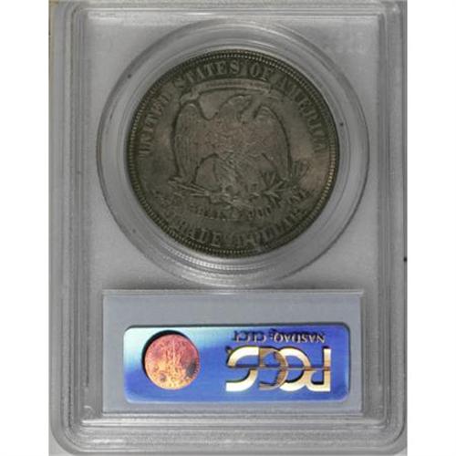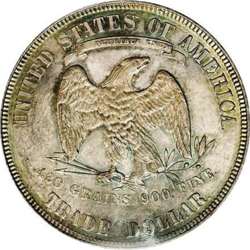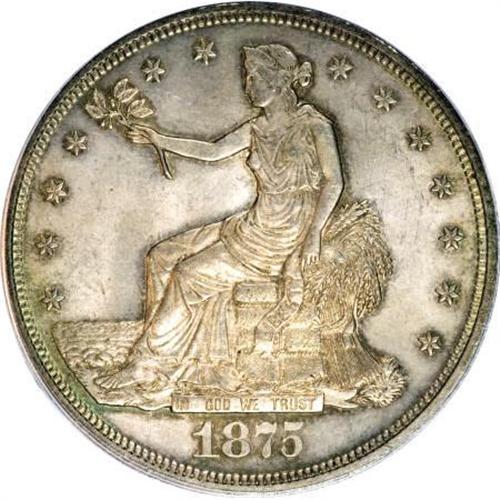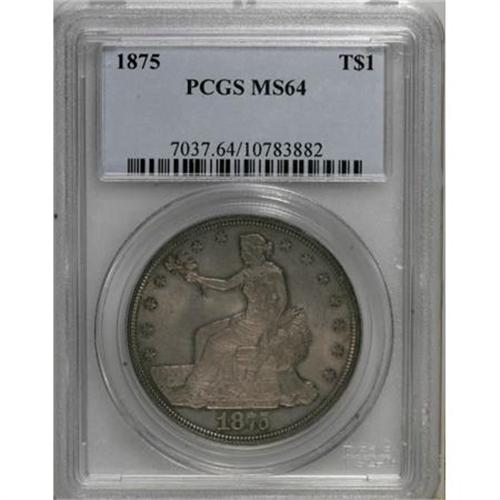 <B>1875 T$1 MS64 PCGS.</B></I> Type One Obverse/Type Two Reverse. The 1875 Trade dollar is somewhat less elusive than believed a couple of decades ago, but still scarce in the higher Mint State grades. This piece displays muted luster over consistently patinated pinkish-gray surfaces. The strike is a bit blunt on the eagle's claws and Liberty's head, but pleasing elsewhere, and there are few obvious signs of contact. Population: 18 in 64, 3 finer (3/08).<BR><BR><B>Coin Engraver:</B> William Barber<BR><BR><b>Shipping:</b> Coins & Currency (<a target="_blank" href="http://www.heritageauctions.com/common/shipping.php">view shipping information</a>)