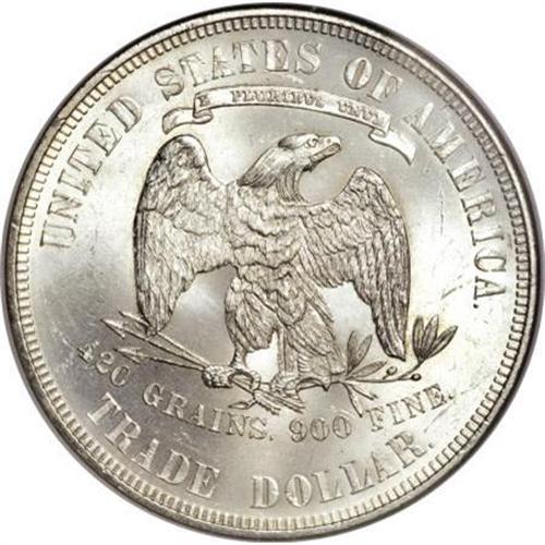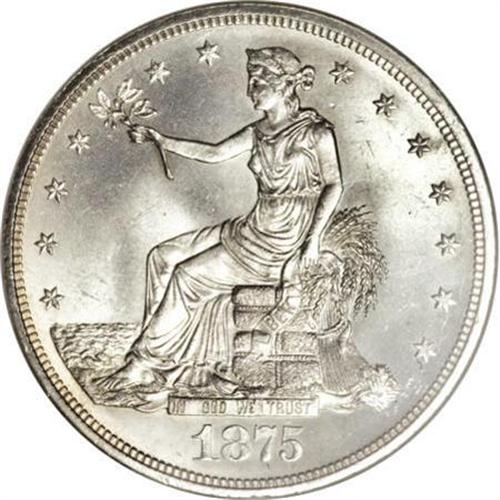 <B>1875 T$1 MS65 NGC.</B></I> Type Two Reverse. In the first two years of Trade dollar production, the striking qualities of the dies came into question, and the engraver, William Barber, made modifications to the reverse and obverse in 1875 and 1876, respectively. Following his alterations to the designs, however, he notified nobody but the chief coiner of his actions, and it is likely that the changes went unnoticed until eagle-eyed numismatists pointed out the subtle but obvious differences.<BR> This Reverse 2 example is a shining and essentially untoned Gem, uncommonly well-defined with a particularly bold impression on the eagle's talons. The luster of each side is intense beneath just a hint of haze, and the overall eye appeal is excellent. A luster graze to the left of the ER in AMERICA, though consistent with the MS65 grade, precludes a finer designation. Census: 8 in 65, 3 finer (1/08).<BR><I>From The Southwest Collection.</B></I><BR><BR><B>Coin Engraver:</B> William Barber<BR><BR><b>Shipping:</b> Coins & Currency (<a target="_blank" href="http://www.heritageauctions.com/common/shipping.php">view shipping information</a>)