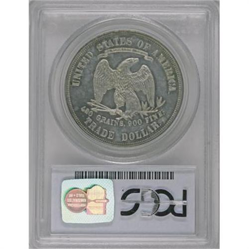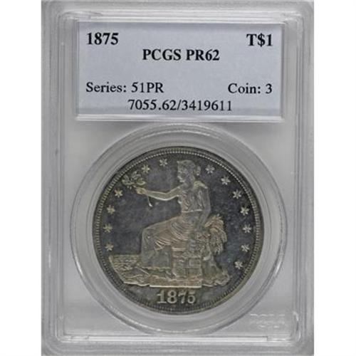 <B>1875 T$1 PR62 PCGS.</B></I> Type One Reverse. Golden-brown, apple-green, and ruby-red freckles embrace the borders of this flashy and lightly hairlined representative. A good strike with localized weakness on the eagle's right (facing) claw. One of only 700 proofs struck.<BR><BR><B>Coin Engraver:</B> William Barber<BR><BR><b>Shipping:</b> Coins & Currency (<a target="_blank" href="http://www.heritageauctions.com/common/shipping.php">view shipping information</a>)