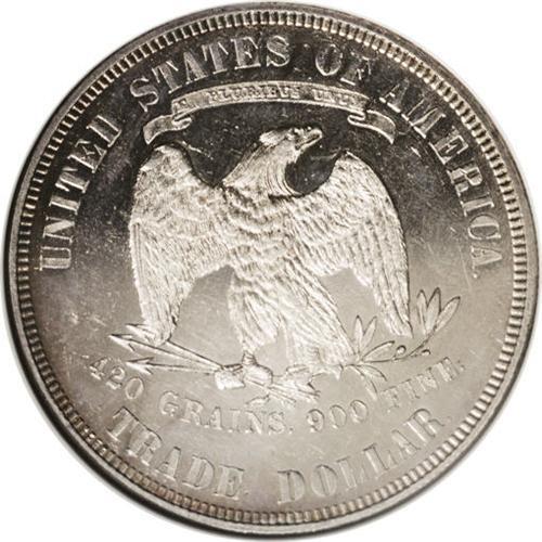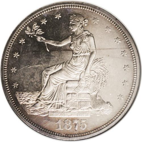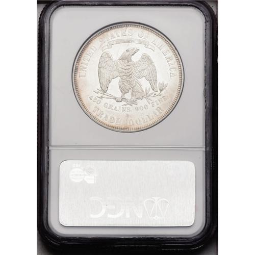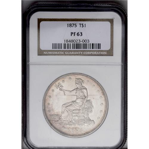 <B>1875<T$1> PR63 NGC.</B></I> Type Two Reverse. Well mirrored with attractive champagne-gray toning and flashes of rose and russet iridescence here and there about the margins. A russet-brown toning streak bisects the upper half of the obverse. This date and all of the other Trade dollar dates that are not proof-only are actually seen less often than the 1879-1883 proofs.