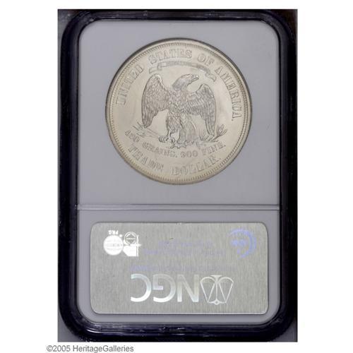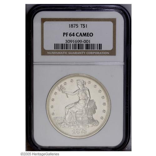 <B>1875<T$1> PR64 Cameo NGC.</B></I> Type One Reverse. While the 1875 is undistinguished among other proofs in the series, what sets this piece apart is the noticeable contrast between the fields and devices. Brilliant throughout, this "white on black" effect is quite pronounced and there are only a few light hairlines that prevent a full Gem grade. Population: 18 in 64, 17 finer (10/05).