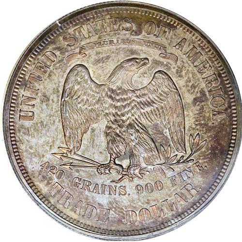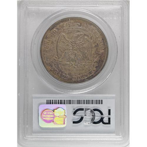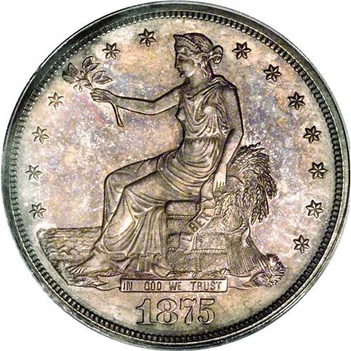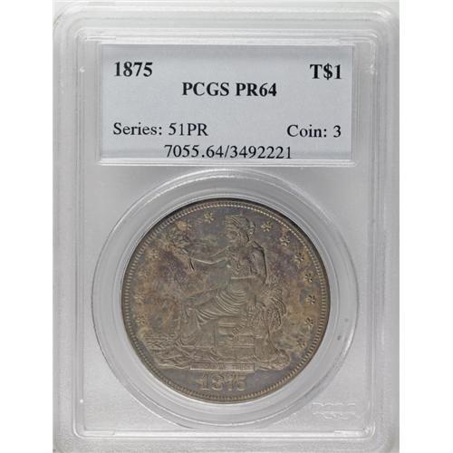 <B>1875 T$1 PR64 PCGS.</B></I> Type One Reverse. The 1875 is scarce either as a proof or an Uncirculated business strike, and that is without taking into account additional demand from hub subtype collectors. This near-Gem features deep ice-blue and autumn-brown obverse toning, while the reverse is deeply toned ruby-red, orange, and gold. The strike is intricate save for the eagle's right (facing) claw. Population: 56 in 64, 15 finer (9/06).<BR><I>From The Jones Beach Collection.</B></I><BR><BR><b>Shipping:</b> Coin/Currency (<a target="_blank" href="http://www.heritageauctions.com/common/shipping.php">view shipping information</a>)