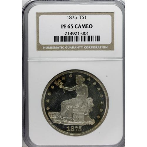 1875 T$1 PR65 Cameo NGC. Type I obverse, Type II rever