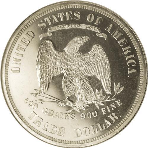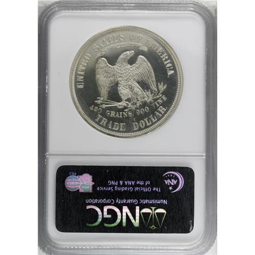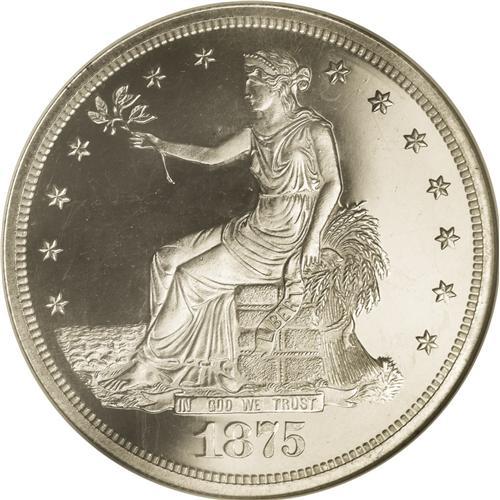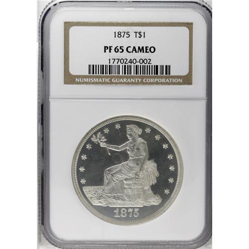 <B>1875<T$1> PR65 Cameo NGC.</B></I> Type One Reverse. The obverse is well struck, as is the reverse save for the eagle's right (facing) leg. A hint of gold toning graces the borders. The white-on-black distinction confirms the eye appeal. Just 700 proofs were struck, and the business strike production was also low. Census: 15 in 65 Cameo, 4 finer (6/06).<BR><I>From The Mulholland Collection.</B></I>