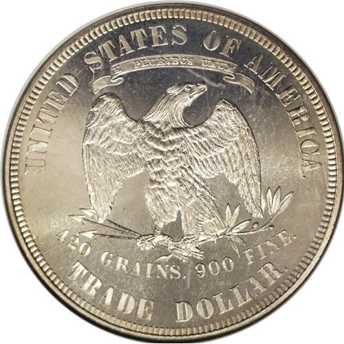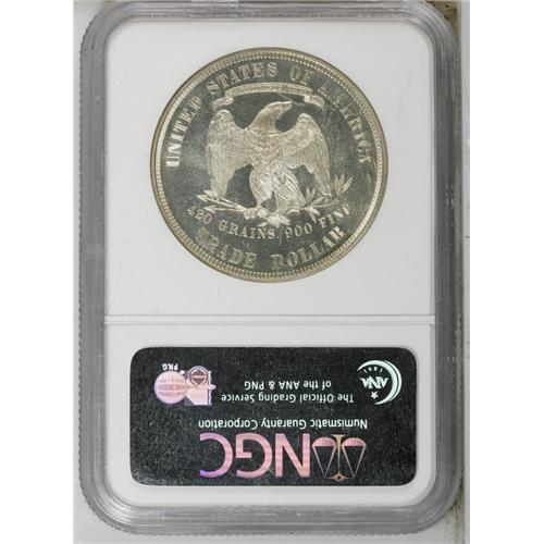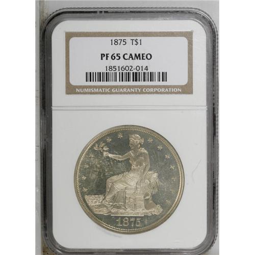 <B>1875<T$1> PR65 Cameo NGC.</B></I> Type Two Reverse. Delicate but consistent light gold toning graces this lovely Cameo Gem proof Trade dollar. The strike is razor-sharp, even on such often mushy areas as Liberty's hair and the eagle's claws. A few nearly imperceptible parallel hairlines are detected beneath the branch stem, and faint mint-made planchet streaks are found above the eagle's beak and through the final letters in AMERICA, but these are of little significance. Only 700 proofs were struck, and the scarcity of Uncirculated business strikes for this date contributes to the demand for high quality proofs. Census: 16 in 65 Cameo, 4 finer (9/06).