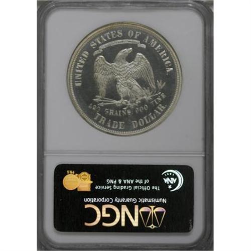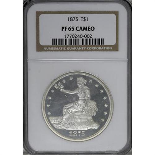 <B>1875 T$1 PR65 Cameo NGC.</B></I> Type One Reverse. The obverse is well struck, as is the reverse, save for the eagle's right (facing) leg. A hint of gold toning graces the borders. The white-on-black contrast is noteworthy on both sides. Just 700 proofs were struck, and the business strike production was also quite low. Census: 16 in 65 Cameo, 5 finer (10/07). <BR><BR><b>Shipping:</b> Coins & Currency (<a target="_blank" href="http://www.heritageauctions.com/common/shipping.php">view shipping information</a>)