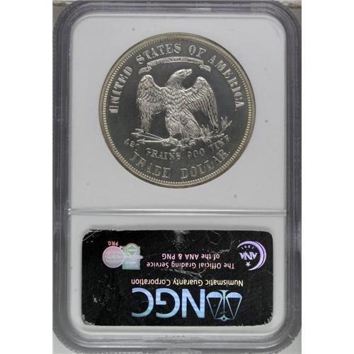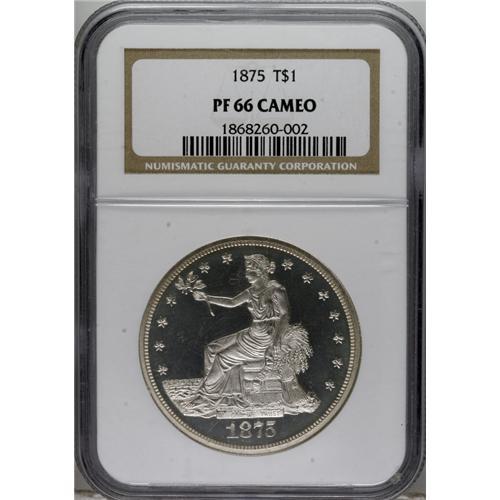 <B>1875 T$1 PR66 Cameo NGC.</B></I> Type One Reverse, with a berry near the fletchings. This reverse subtype is probably limited to the 300 proofs delivered in January 1875. The icy devices provide obvious contrast with the glassy fields. The strike is exacting except for slight merging of detail on the eagle's right (facing) claw. Brilliant and beautiful, although the NGC holder itself has a few faint hairlines that unfairly reflect upon the virtually pristine mirrored fields. Only 700 proofs (for both subtypes) were struck, and the associated business strike emission was the lowest of the 1873 to 1877 Philadelphia issues. Census: 4 in 66 Cameo, 0 finer (3/07).<BR><BR><b>Shipping:</b> Coins & Currency (<a target="_blank" href="http://www.heritageauctions.com/common/shipping.php">view shipping information</a>)