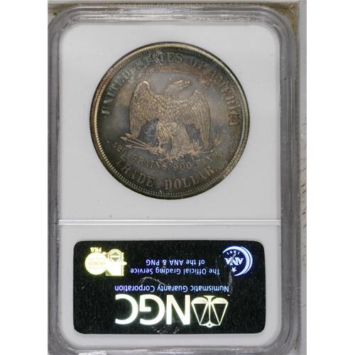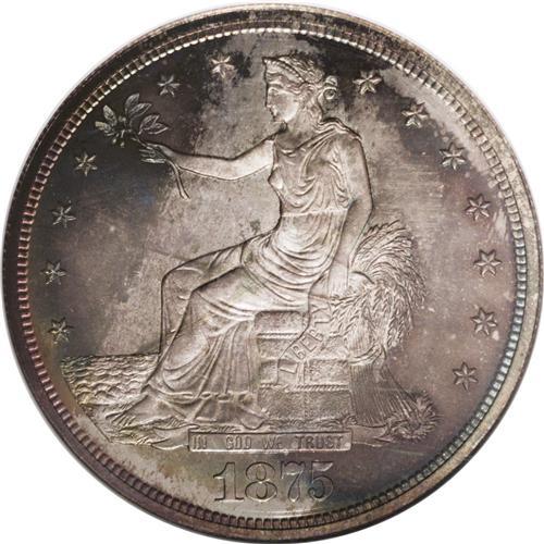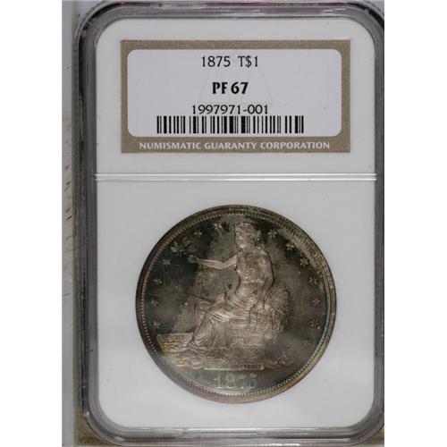 <B>1875<T$1> PR67 NGC.</B></I> Type One Reverse, identified by the presence of a berry beneath the right (facing) claw. Only 700 proof 1875 trade dollars were struck, and based upon our auction records, these pieces appear to be about equally divided between the Type One and Type Two designs. Demand for 1875 proofs is furthered by the scarcity of Mint State examples, since the 1875 has the lowest business strike mintage from Philadelphia. The present Superb Gem is beautifully toned in rich orange, ocean-blue, and ruby-red hues. Post-strike imperfections are essentially absent, and the strike is precise except for the eagle's right (facing) claw. NGC and PCGS combined have certified only five pieces at the PR67 level with none finer (9/06).