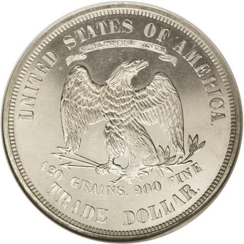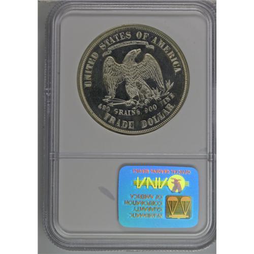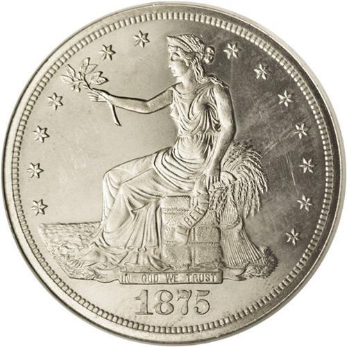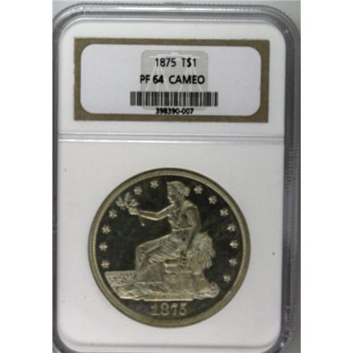 <B>1875<T$1> Trade PR64 Cameo NGC.</B></I> Type One Reverse. Frosty devices contrast with glittering mirrored fields. This near-Gem has only a hint of gold toning, and striking incompleteness is limited to the eagle's right (facing) leg. Either as a proof or a business strike, the 1875 is scarce in unimpaired state. Just 700 proofs were struck. Census: 18 in 64 Cameo, 18 finer (7/06).<BR><I>Ex: Superior, 10/00, lot 3566.</B></I><BR><I>From The Antigo Collection.</B></I>