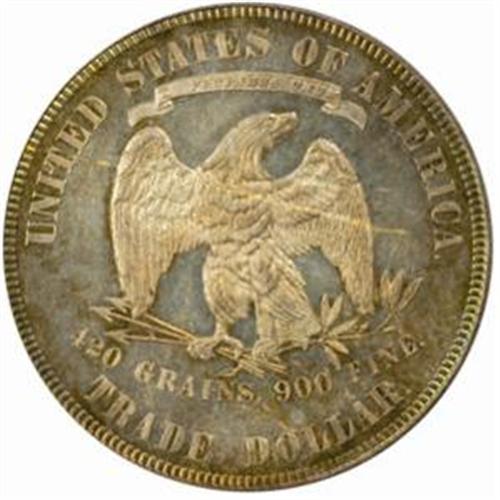 <style type="text/css"> body, td, th { font-family: Arial, Helvetica, sans-serif; font-size: 12px; color: #482424; margin: 0px; padding: 0px; } #header { background-image: url(http://www.bowersandmerena.com/ebay/images/template_v3_01.gif); clear: both; background-color: #590303; border-top-width: 2px; border-top-style: solid; border-top-color: #B38C4F;}#header #header_wrapper { height: 75px; clear: both; width: 800px; margin-right: auto; margin-left: auto; background-image: url(http://www.bowersandmerena.com/ebay/images/template_v3_03.gif); background-repeat: no-repeat; background-position: right; color: #F3EDCC;}#header #header_wrapper #header_logo { float: left; height: 75px; width: 444px; background-image: url(http://www.bowersandmerena.com/ebay/images/template_v3_02.gif); background-repeat: no-repeat; font-size: 10px; text-transform: capitalize; color: #B38C4F;}#header #header_wrapper #header_right { float: left; height: 75px; width: 356px; text-align: right;}#header #header_wrapper #header_right #headerLoginBtn { margin-bottom: 30px;}#header #header_wrapper #header_right input#txtSearch { color: #B49056; border: 1px solid #B49056; width: 175px; padding-top: 3px; padding-right: 3px; padding-bottom: 4px; padding-left: 3px;}#nav { height: 37px; background-image: url(http://www.bowersandmerena.com/ebay/images/template_v3_05.gif); clear: both;}#nav #nav_wrapper { height: 35px; width: 800px; margin-right: auto; margin-left: auto; border-left-width: 1px; border-left-style: solid; border-left-color: #B38C4F;}#nav #nav_wrapper a { padding-right: 15px; padding-left: 15px; border-right-width: 1px; border-right-style: solid; border-right-color: #B38C4F; height: 25px; padding-top: 10px; display: block; float: left; text-decoration: none; font-weight: bold; color: #5D0303;}#nav #nav_wrapper a:hover { color: #B38C4F;}#nav #nav_wrapper #search { float: right; padding-top: 7px;}#nav #nav_wrapper #search #txtSearch { font-family: Arial, Helvetica, sans-serif; font-size: 10px; text-transform: uppercase; color: #D2AE75; border: 1px solid #B38C4F; padding: 3px;}#content_bgd { background-image: url(http://www.bowersandmerena.com/ebay/images/template_v3_09.gif); background-repeat: repeat-y; background-position: center; padding-top: 15px; padding-bottom: 15px; background-color: #FBFBDB;}#content_wrapper { clear: both; height: auto; width: 800px; margin-right: auto; margin-left: auto;}.LotDetailWhite{ line-height:normal; font-size:13px; font-family: arial,helvetica,sans-serif; color: White; font-weight: bold;}.LotDetailInformation{ line-height:normal; font-size: 13px; font-family: arial,helvetica,sans-serif;}.LotDetailMessage{ line-height:normal; font-size: 13px; font-family: arial,helvetica,sans-serif; color: red;}}tr.HeaderAuctionTitle td { color: #000000; font-weight: bold; padding: 2px; background-image: url(http://www.bowersandmerena.com/ebay/images/template_v3_05.gif); background-repeat: repeat-x; border-bottom-width: 1px; border-bottom-style: solid; border-bottom-color: #B38C4F;}table.AuctionSummary a, table.AuctionSummary a:link, table.AuctionSummary a:visited { color: #0000FF; text-decoration: none;}}td.tableHeaderLeft { border-left-width: 1px; border-left-style: solid; border-left-color: #B38C4F;}td.tableHeaderRight { border-right-width: 1px; border-right-style: solid; border-right-color: #B38C4F;}td.tableCellMiddle { border-left-width: 1px; border-left-style: solid; border-left-color: #B38C4F; border-right-width: 1px; border-right-style: solid; border-right-color: #B38C4F; padding: 5px;}tr.footer td { border-top-width: 1px; border-top-style: solid; border-top-color: #B38C4F;}</style></head><body><div id="header"> <div id="header_wrapper"> <div id="header_logo"> </div> <div id="header_right"> </div> </div></div><div id="nav"> <div id="nav_wrapper"> <a href="http://www.bowersandmerena.com">Our eBayLive Auctions</a> <a href="#PaymentInfo">Payment Information</a> <a href="#ShippingInfo">Shipping Information</a> <a href="#About">About Bowers and Merena</a> </div></div><div id="content_bgd"> <div id="content_wrapper"> <table width="100%" border="0" cellpadding="5" cellspacing="0" class="AuctionSummary"> <tbody> <tr class="HeaderAuctionTitle" style="height: 25px;"> <td align="left" class="tableHeaderLeft" > </td> <td align="center" class="tableHeaderRight"> <span style="font-size: large;">Lot #872. 1875 Trade Dollar. Type I/II. Proof-64 (PCGS).</span> </td> </tr> <tr> <td colspan="3" class="tableCellMiddle"> This originally toned near-Gem exhibits mottled olive, cobalt-blue and orange-copper highlights over a base of softer, more even, silver-gray color. The vibrant overtones are largely confined to the peripheries, but we see sharp striking detail in all areas of the design. A reflective-finish survivor of one of the scarcer, more conditionally challenging issues in the proof Trade Dollar series of 1873-1883.