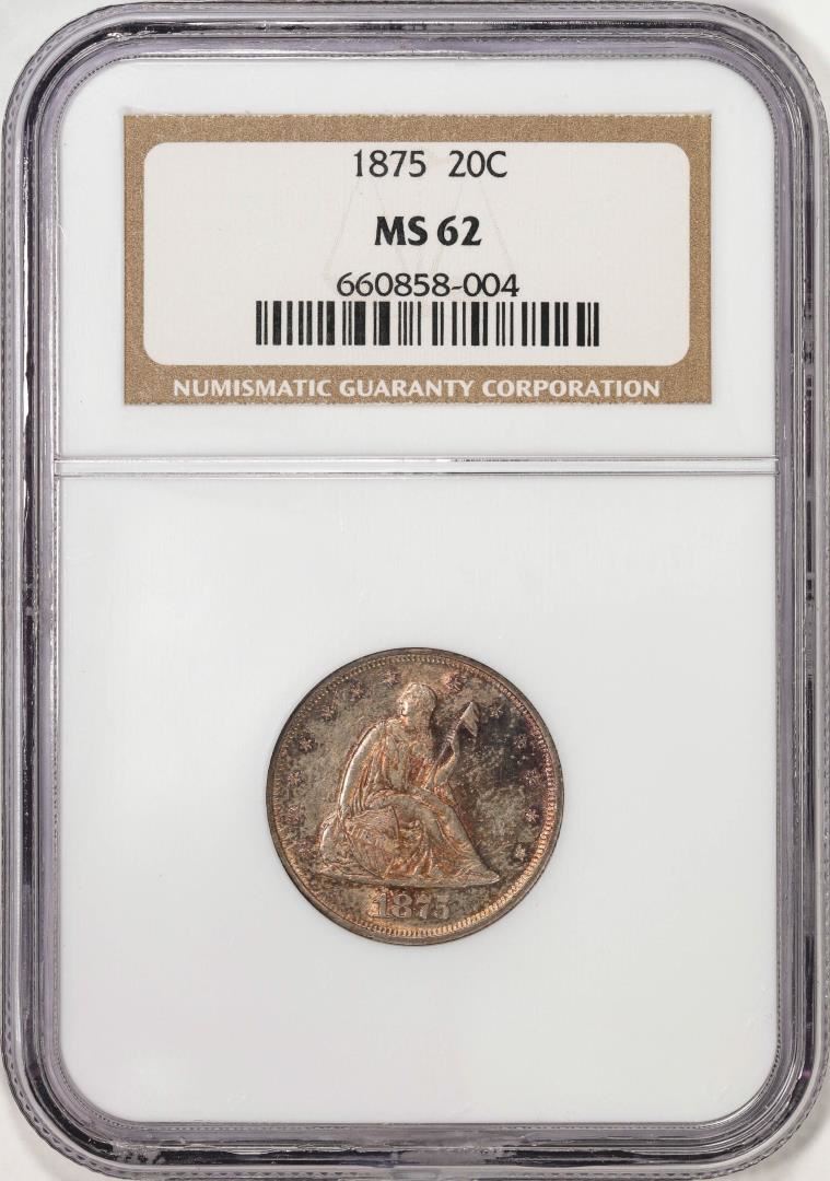 One 1875 Twenty Cent Piece Coin NGC MS62 Great Color. NGC Certified.