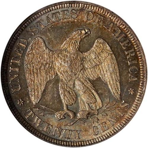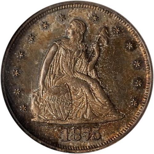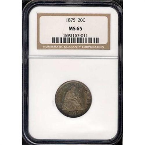 <b>1875 Twenty Cents. NGC graded MS65.</b> A heart-stopping gem of the premium quality one likes to see for this actively collected twenty cent denomination. Swirling cartwheel luster blends naturally with pale toning highlights on the satin surfaces. Viewing this under magnification, we constantly need to remind ourselves that this is a business strike and not a Proof. A short-lived coin, the twenty-cent piece was authorized by the Act of March 3, 1875. Soon after the appearance of the first pieces, people complained about the similarity in design and size to the quarter dollar. The eagle is similar to that used on the Trade dollar, but the edge of this coin is plain, not milled. Yet many found their way into circulation; very few were saved in gem mint condition at the time <b>(PCGS # 5296)</b> <i>