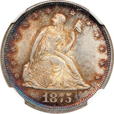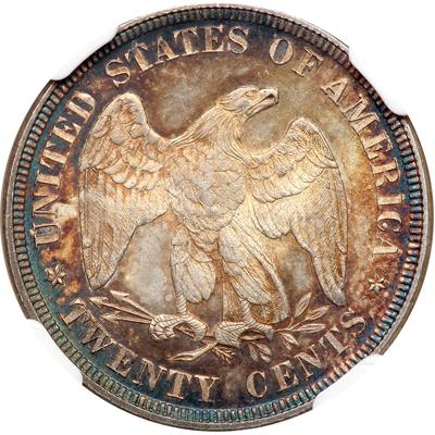 1875 Twenty Cents. NGC graded MS-67. Lovely blue and golden toning. The Philadelphia Mint produced the twenty-cent denomination intended for circulation in 1875 and 1876 only, with mintages of 36,910 and 14,640, respectively. Fewer than a hundred specimens have ever received any gem grade by either NGC or PCGS and the 1875 issue is about twice as rare in gem condition. The present specimen is spectacular and is one of the finest examples known for the twenty-cent denomination! Satiny silver surfaces are glazed with soft champagne toning and accented by magenta and electric blue peripheral toning. On both the obverse and reverse, the devices are frosty; the luster shifts and skips across them without pause. Razor-sharp devices are free from any abrasions. An extremely important opportunity for someone looking for a finest known twenty-cent type example! Best of all: Pop 5; none finer. In a new 4 prong NGC holder.