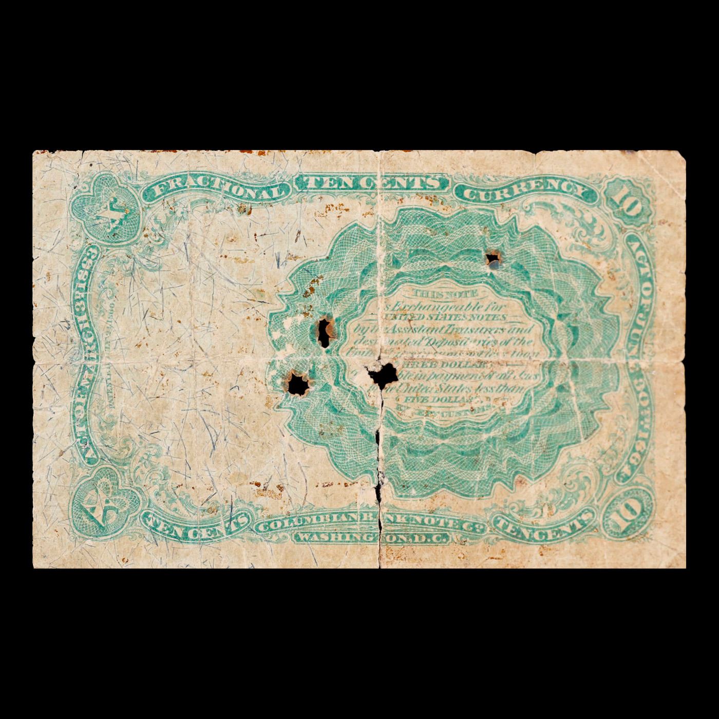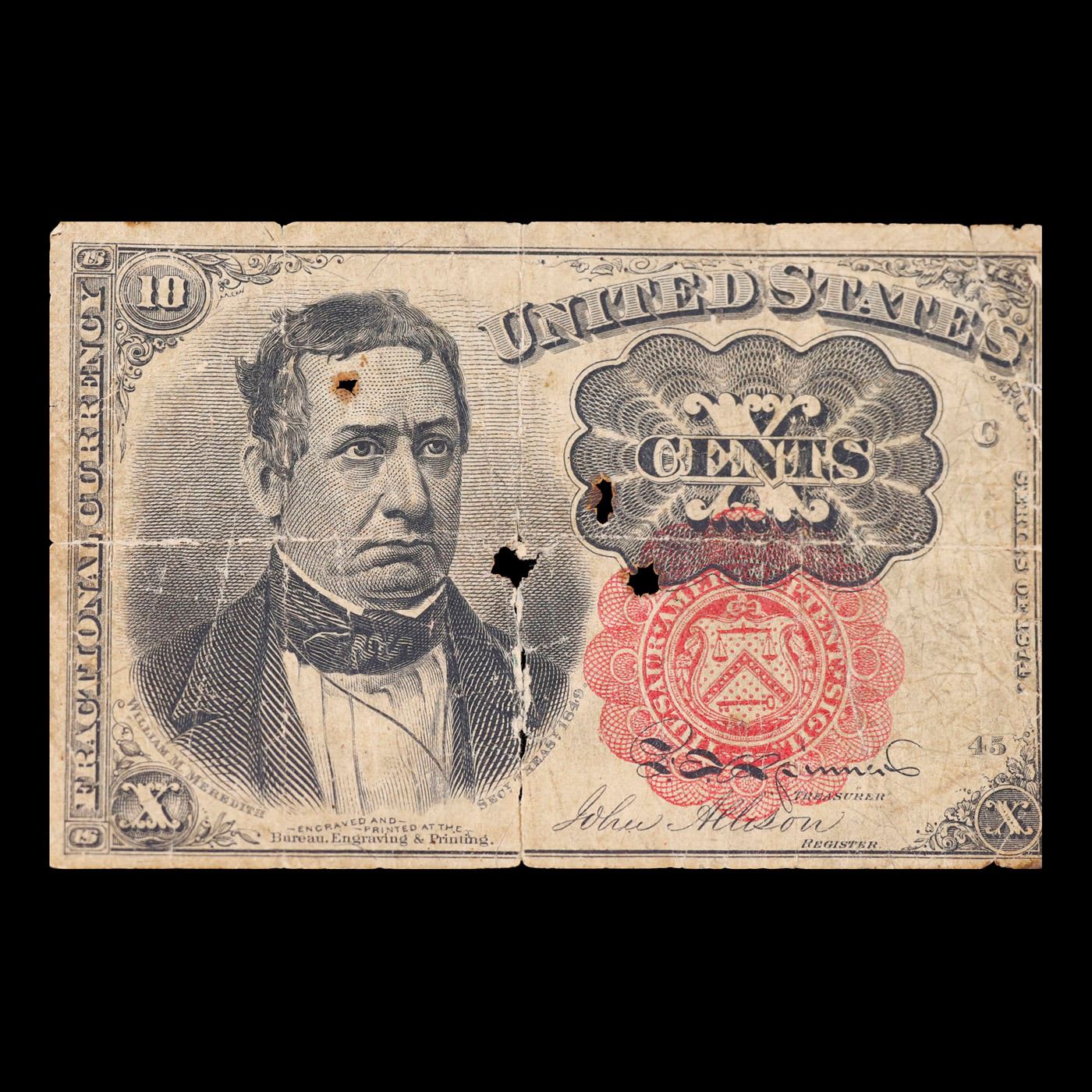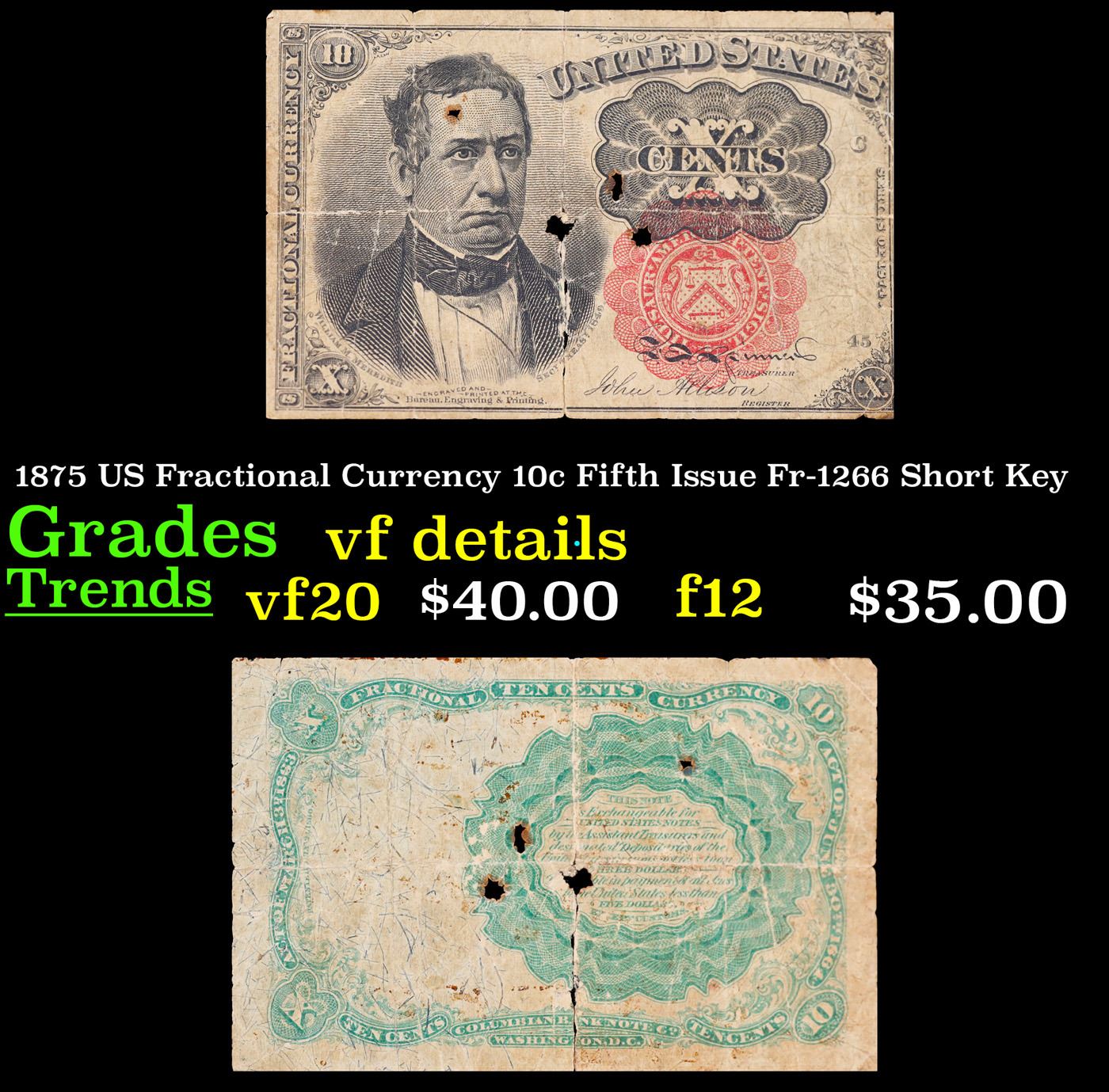 1875 US Fractional Currency 10c Fifth Issue Fr-1266 Short Key Grades vf details. Fractional or postage currency has a rich history. At the beginning of the Civil War people starting hoarding coins for their precious metal content. Coins became difficult to find because of the hoarding. People started to try to use stamps instead of coins as a means of commerce. The government decided to help ease the hoarding issue by issuing “paper coins” also known as postage currency or fractional currency. Fractional currency was first issued on August 21, 1862 and they were last issued on February 15, 1876. Three cents, five cents, ten cents, twenty-five cents, and fifty cents notes were all issued. Fractional currency is physically smaller than other United States money. It also does not have a serial number. William Meredith is pictured on the front.