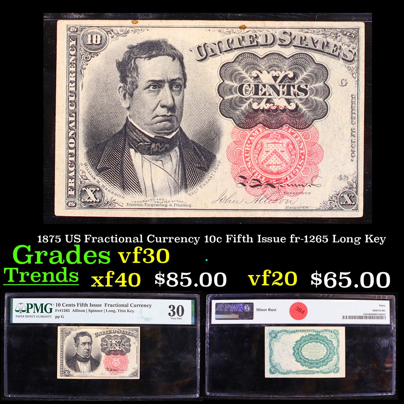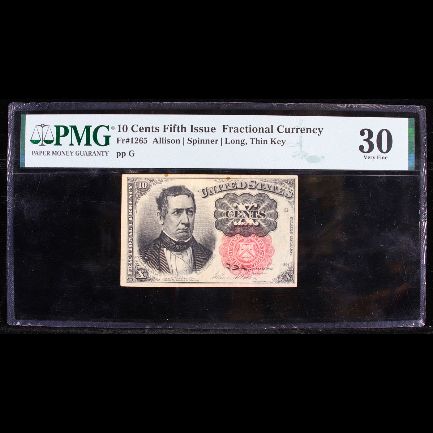 1875 US Fractional Currency 10c Fifth Issue fr-1265 Long Key Graded vf30 By PMG. Fractional or postage currency has a rich history. At the beginning of the Civil War people starting hoarding coins for their precious metal content. Coins became difficult to find because of the hoarding. People started to try to use stamps instead of coins as a means of commerce. The government decided to help ease the hoarding issue by issuing “paper coins” also known as postage currency or fractional currency. Fractional currency was first issued on August 21, 1862 and they were last issued on February 15, 1876. Three cents, five cents, ten cents, twenty-five cents, and fifty cents notes were all issued. Fractional currency is physically smaller than other United States money. It also does not have a serial number.