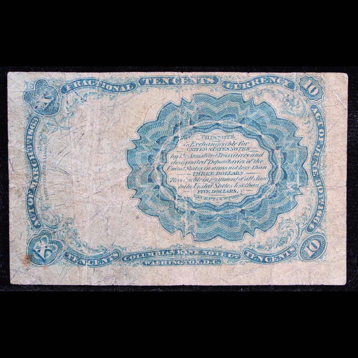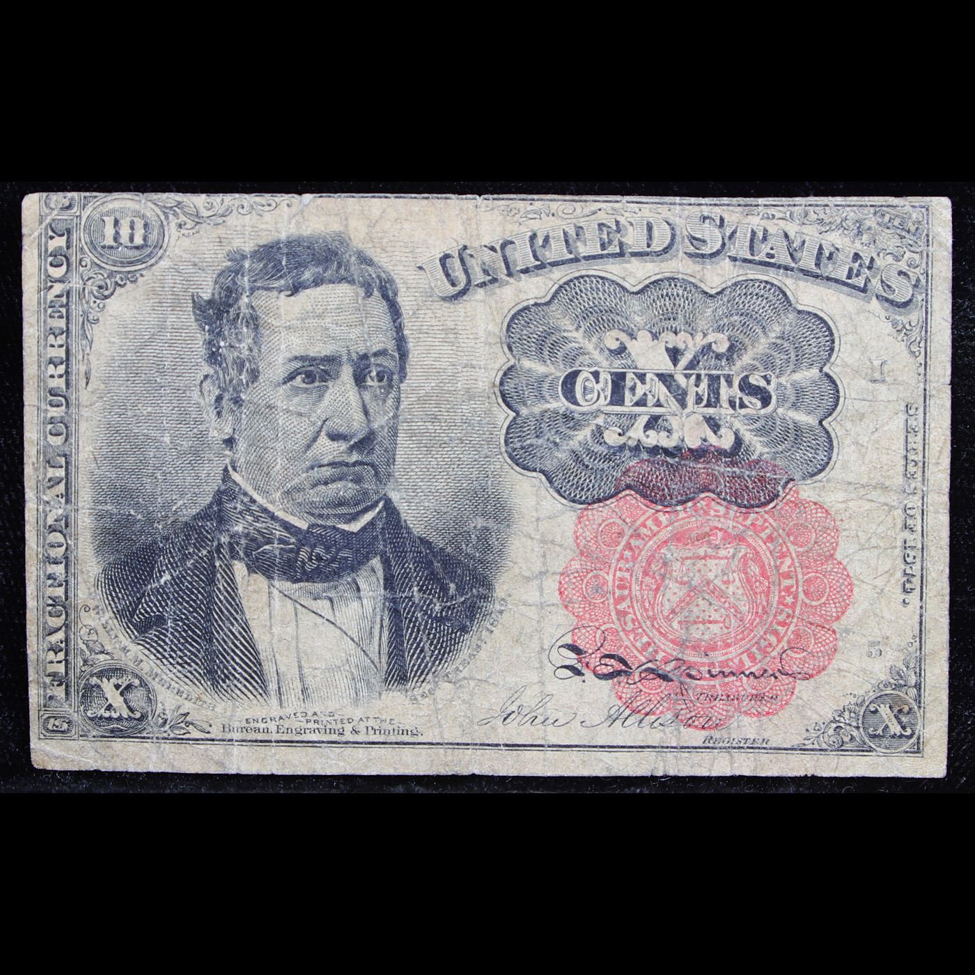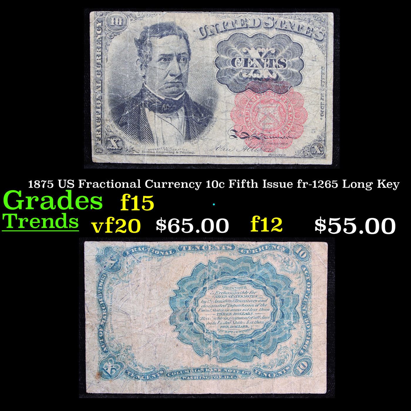 1875 US Fractional Currency 10c Fifth Issue fr-1265 Long Key Grades f+. Fractional or postage currency has a rich history. At the beginning of the Civil War people starting hoarding coins for their precious metal content. Coins became difficult to find because of the hoarding. People started to try to use stamps instead of coins as a means of commerce. The government decided to help ease the hoarding issue by issuing “paper coins” also known as postage currency or fractional currency. Fractional currency was first issued on August 21, 1862 and they were last issued on February 15, 1876. Three cents, five cents, ten cents, twenty-five cents, and fifty cents notes were all issued. Fractional currency is physically smaller than other United States money. It also does not have a serial number.