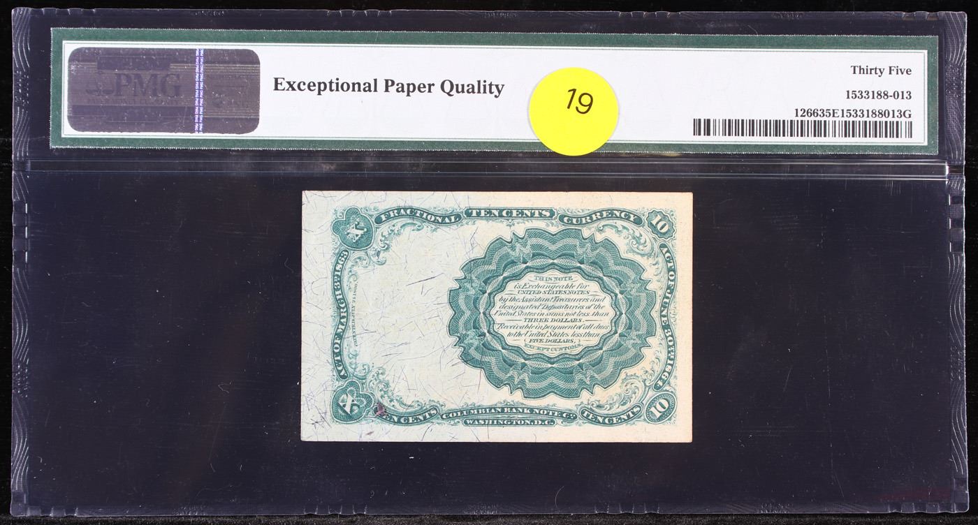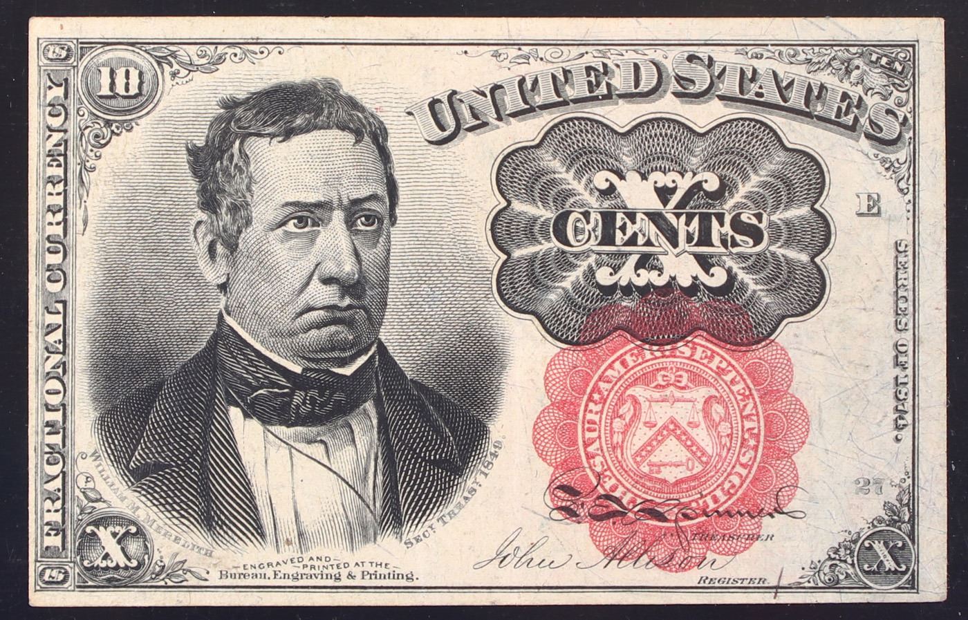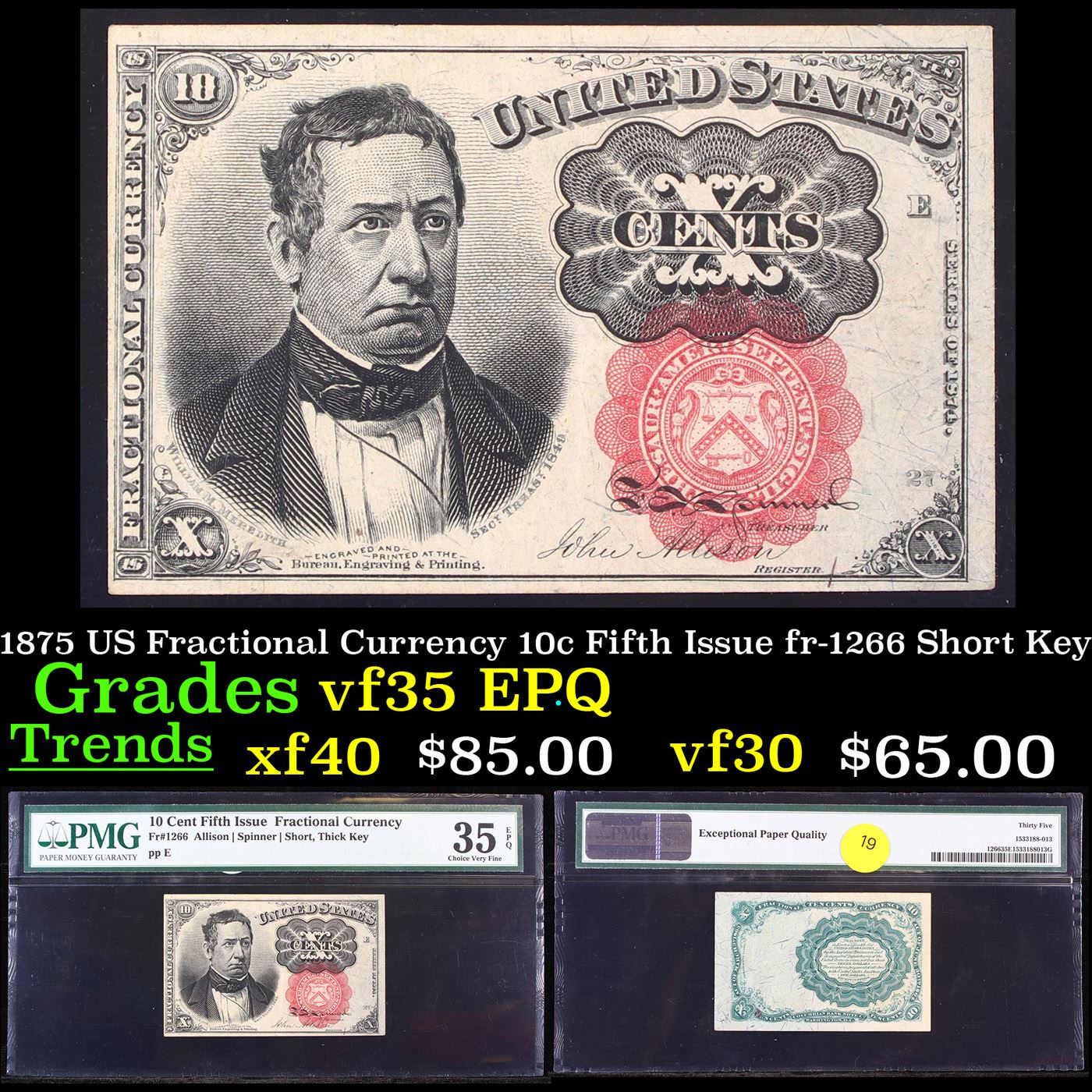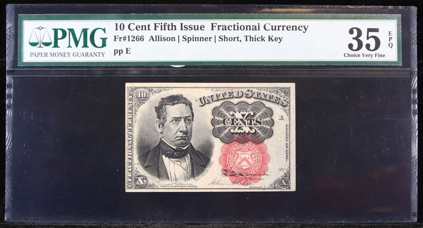1875 US Fractional Currency 10c Fifth Issue fr-1266 Short Key Graded vf35 EPQ By PMG. Fractional or postage currency has a rich history. At the beginning of the Civil War people starting hoarding coins for their precious metal content. Coins became difficult to find because of the hoarding. People started to try to use stamps instead of coins as a means of commerce. The government decided to help ease the hoarding issue by issuing “paper coins” also known as postage currency or fractional currency. Fractional currency was first issued on August 21, 1862 and they were last issued on February 15, 1876. Three cents, five cents, ten cents, twenty-five cents, and fifty cents notes were all issued. Fractional currency is physically smaller than other United States money. It also does not have a serial number.