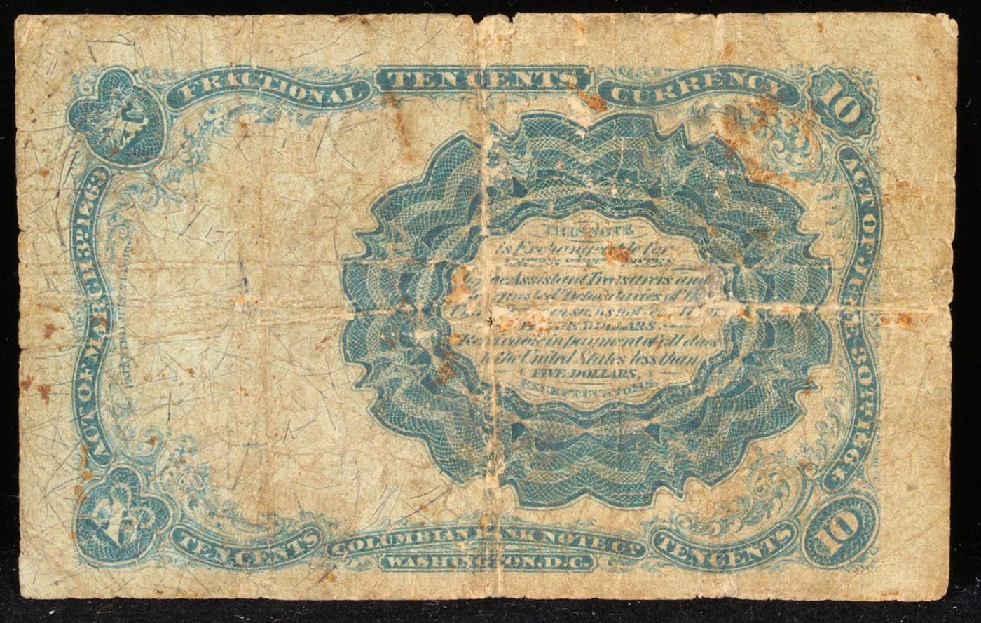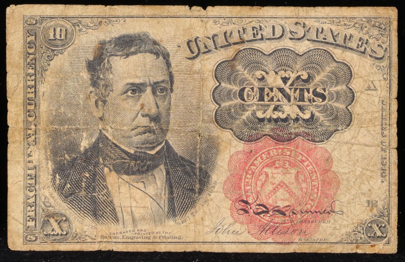 1875 US Fractional Currency 10c Fifth Issue fr-1266 Short Key Grades f, fine. Fractional or postage currency has a rich history. At the beginning of the Civil War people starting hoarding coins for their precious metal content. Coins became difficult to find because of the hoarding. People started to try to use stamps instead of coins as a means of commerce. The government decided to help ease the hoarding issue by issuing “paper coins” also known as postage currency or fractional currency. Fractional currency was first issued on August 21, 1862 and they were last issued on February 15, 1876. Three cents, five cents, ten cents, twenty-five cents, and fifty cents notes were all issued. Fractional currency is physically smaller than other United States money. It also does not have a serial number. William Meredith is pictured on the front.